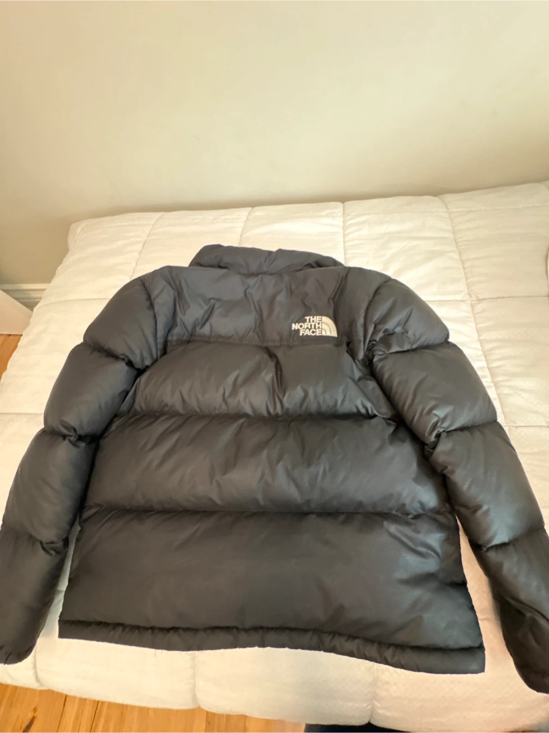 This is a black puffer jacket from The North Face. It's a size XL and has "700" printed on the sleeve. This jacket is suitable for cooler weather.