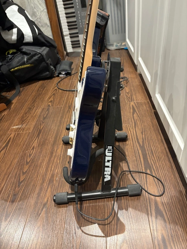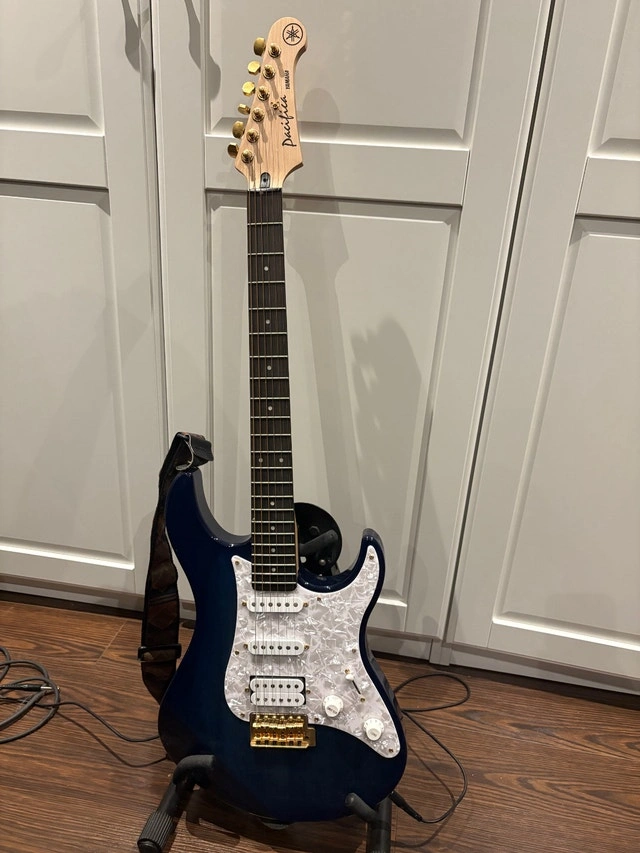 Yamaha Pacifica electric guitar in excellent condition. Classic Strat style body with HSS pickup configuration, very versatile for rock, blues, pop, and clean tones. Dark blue finish, smooth neck, comfortable to play. Gold hardware. Recently checked and plays well. Includes guitar strap, hard case, and adjustable tripod guitar stand. No cracks or damage, only normal light wear. Great for beginners through intermediate players. Selling due to downsizing.