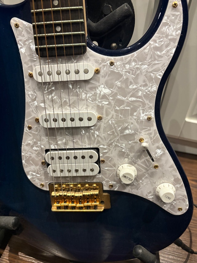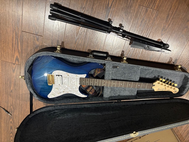 Yamaha Pacifica electric guitar in excellent condition. Classic Strat style body with HSS pickup configuration, very versatile for rock, blues, pop, and clean tones. Dark blue finish, smooth neck, comfortable to play. Gold hardware. Recently checked and plays well. Includes guitar strap, hard case, and adjustable tripod guitar stand. No cracks or damage, only normal light wear. Great for beginners through intermediate players. Selling due to downsizing.