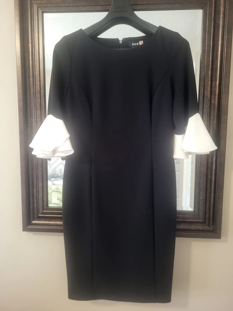 DKNY black sheath dress. It's got eye-catching white ruffle flare sleeves. A classic style for any occasion!