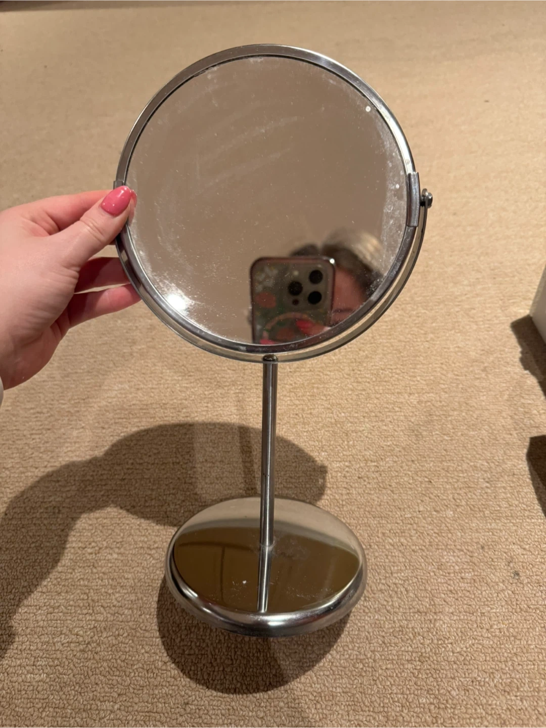 This IKEA TRENSTAD vanity mirror has a chrome finish and a weighted base. It's perfect for applying makeup or for any grooming needs. The mirror is round and sits on a stand.