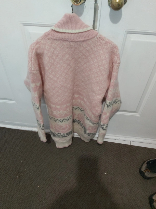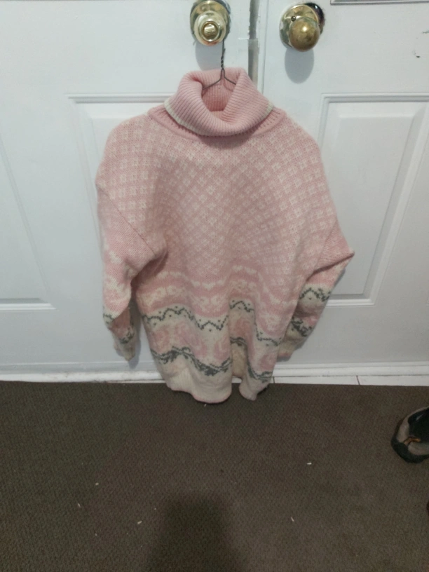 Women's size medium pink turtleneck sweater. Features a Fair Isle pattern. 100% Shetland wool. Cash only.