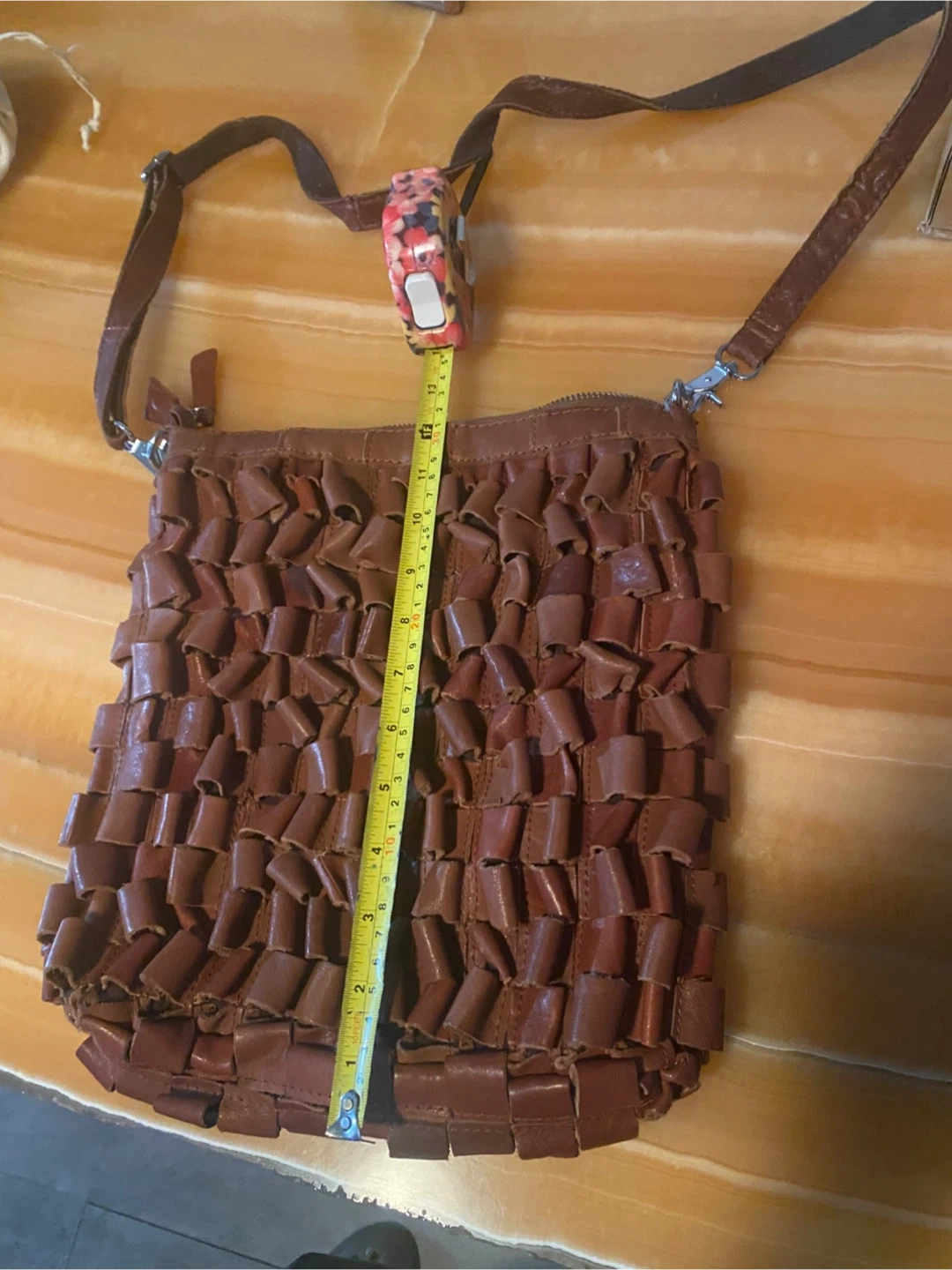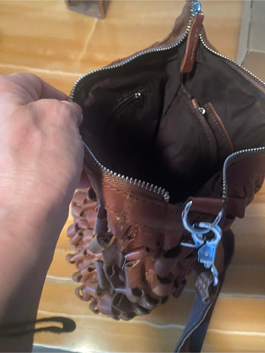 1-Brown custom-made covered in leather loops. Three inside zippers really really well made. Kind of bag that will outlive you. 80 bucks. Was 150$