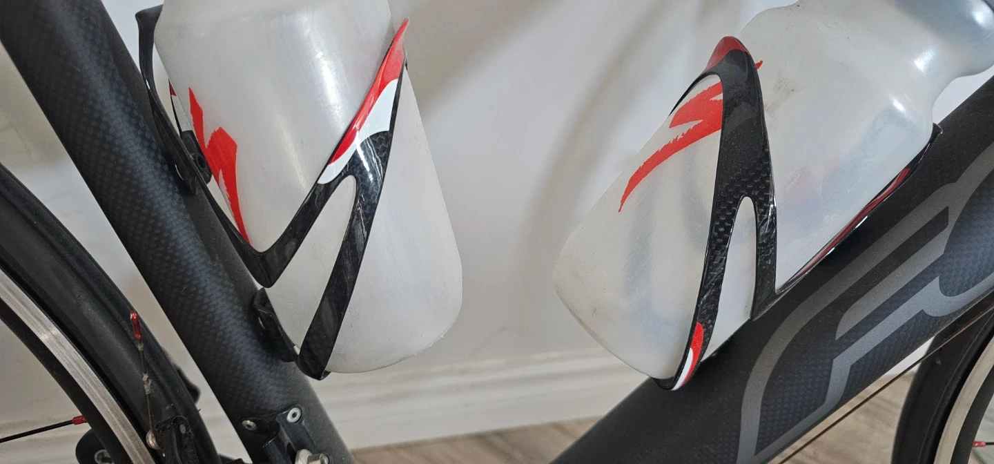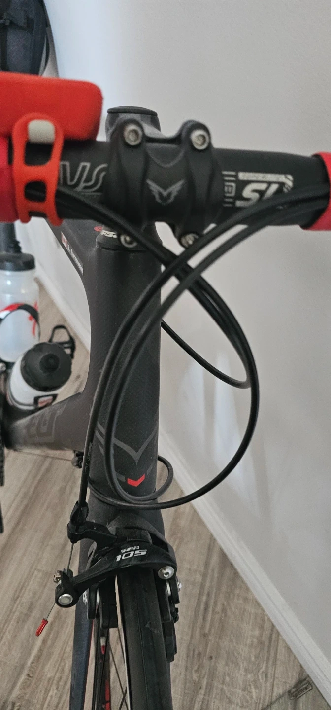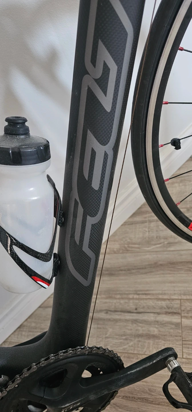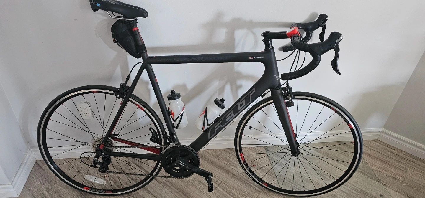 This is a black carbon fibre FELT road bike. It's equipped with Shimano 105 components and includes two water bottles. It's ready for your next ride! Triathlon seat costs $250 for the seat alone. Frame is XL for tall riders. Will include a $400 new spare carbon fiber Forks spare part.. Bike has less than 1000km on it.