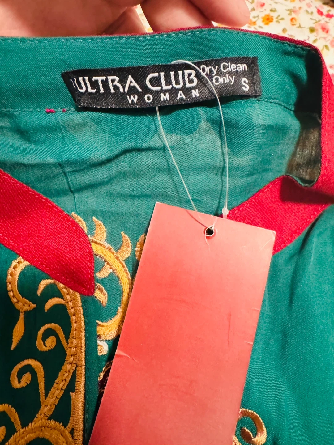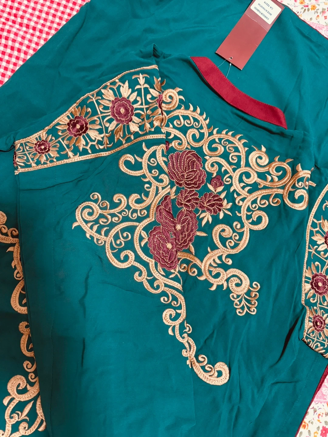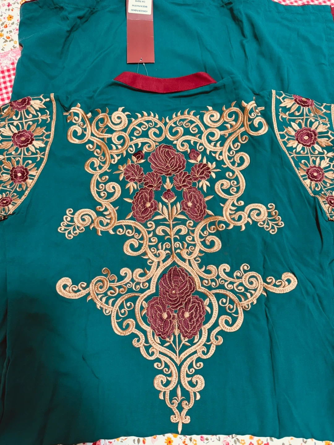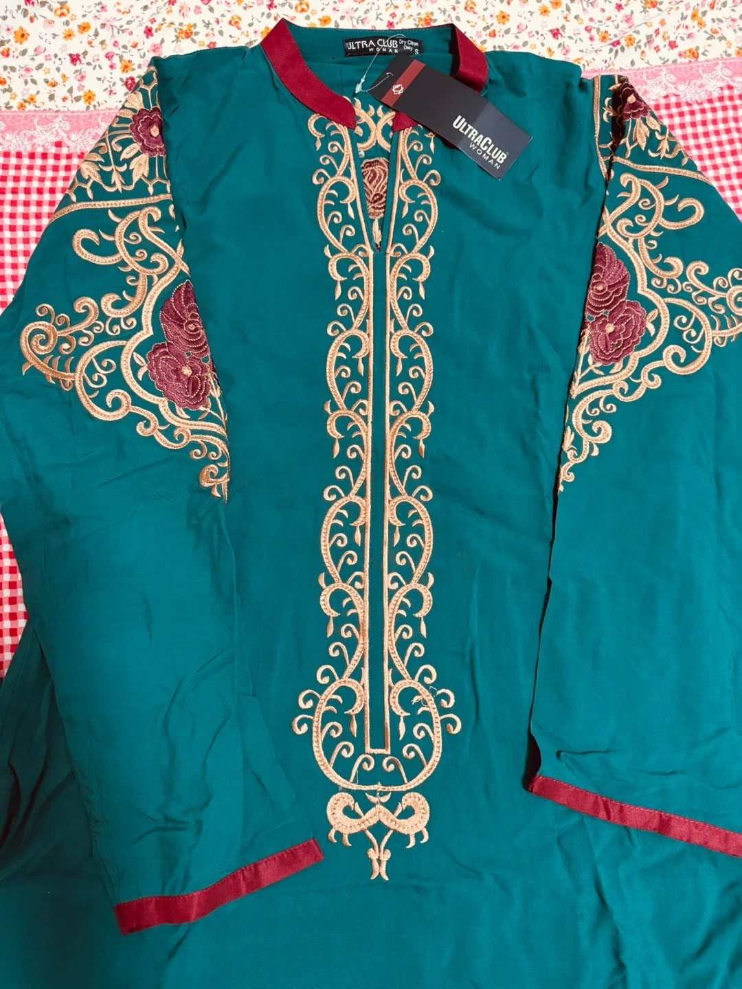 Embroidered teal green kurti by ULTRA CLUB. It has intricate gold and maroon embroidery on the front and sleeves. This kurti features a maroon-trimmed neckline. Available in size medium. It has a very soft dupatta with a pant