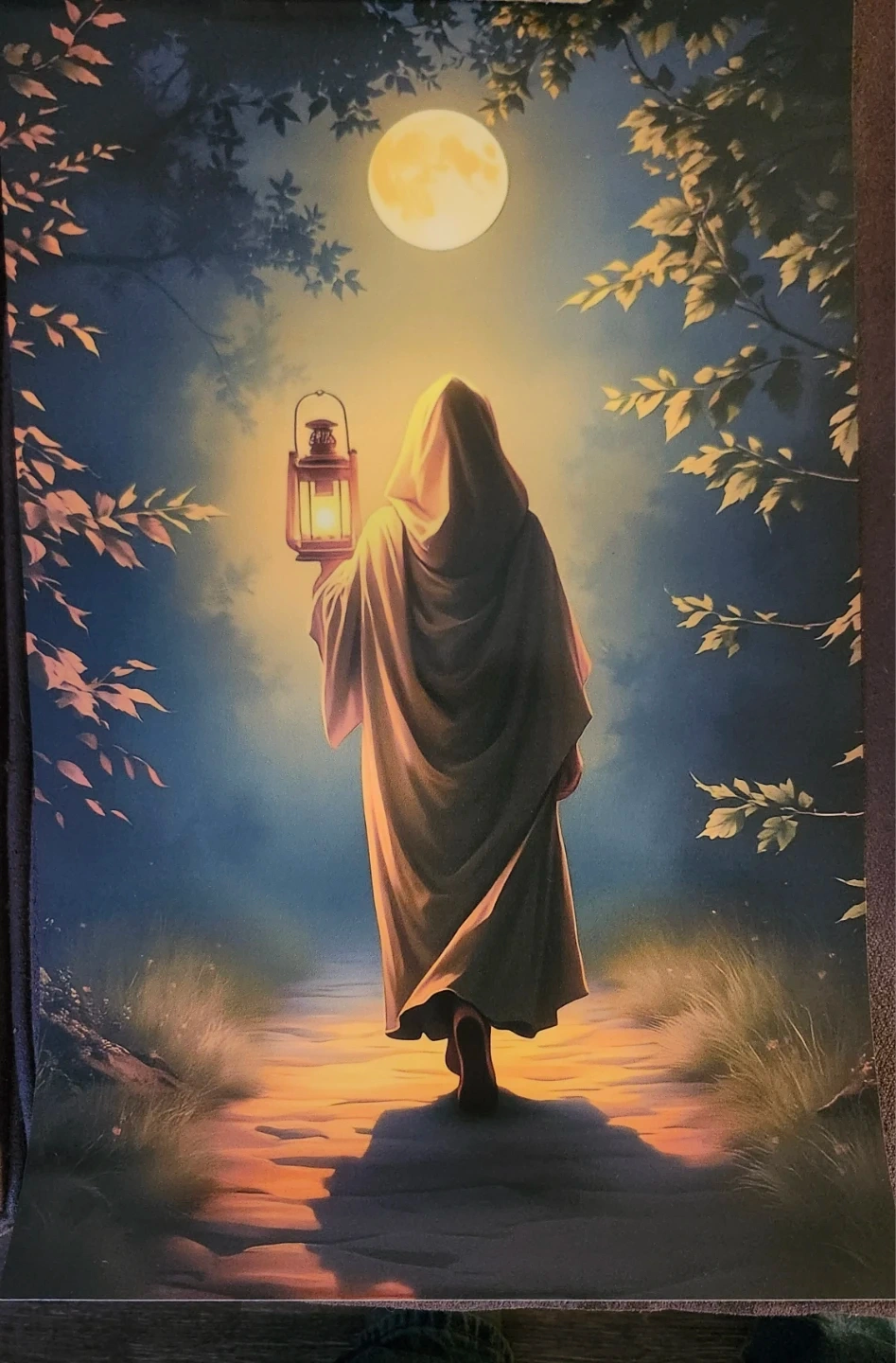 This art print depicts a cloaked figure holding a lantern, walking under a full moon through a forest path. The colours are rich and atmospheric, with a glowing moon and lantern light.