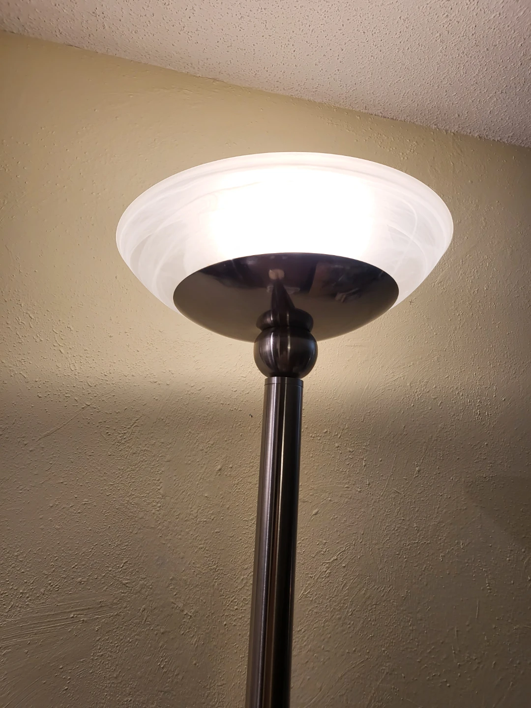 The lamp is well built and has a weight to it. Has a frosted glass shade that diffuses light beautifully. 72 inches or 6 feet tall.