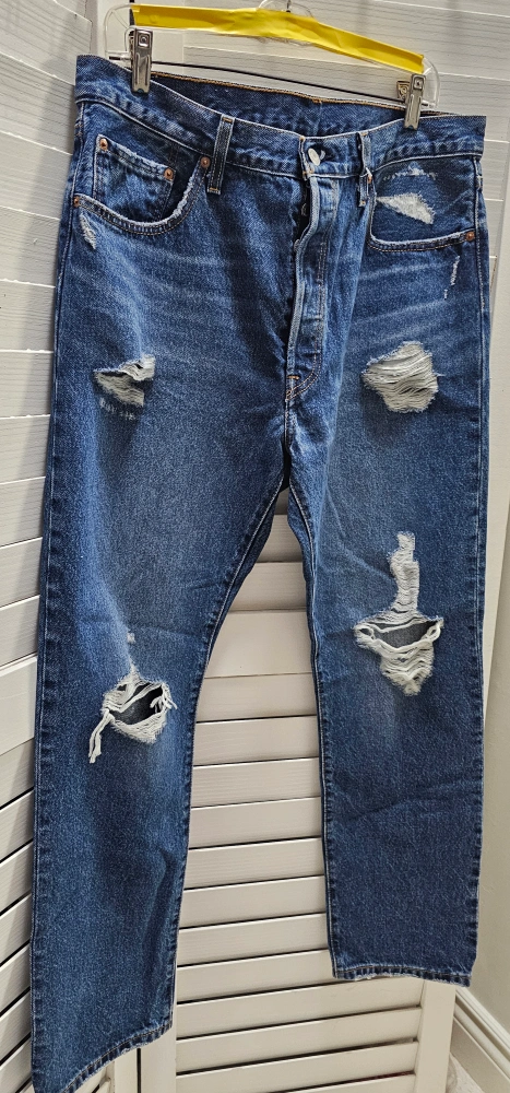 Levi's 501 jeans in a W33 L30 size. They are in a distressed style with rips and tears. Classic denim look!