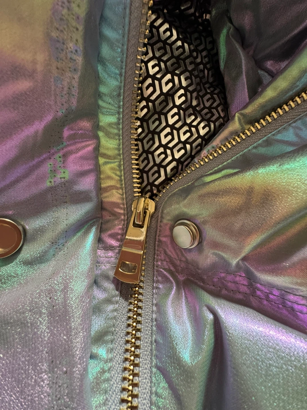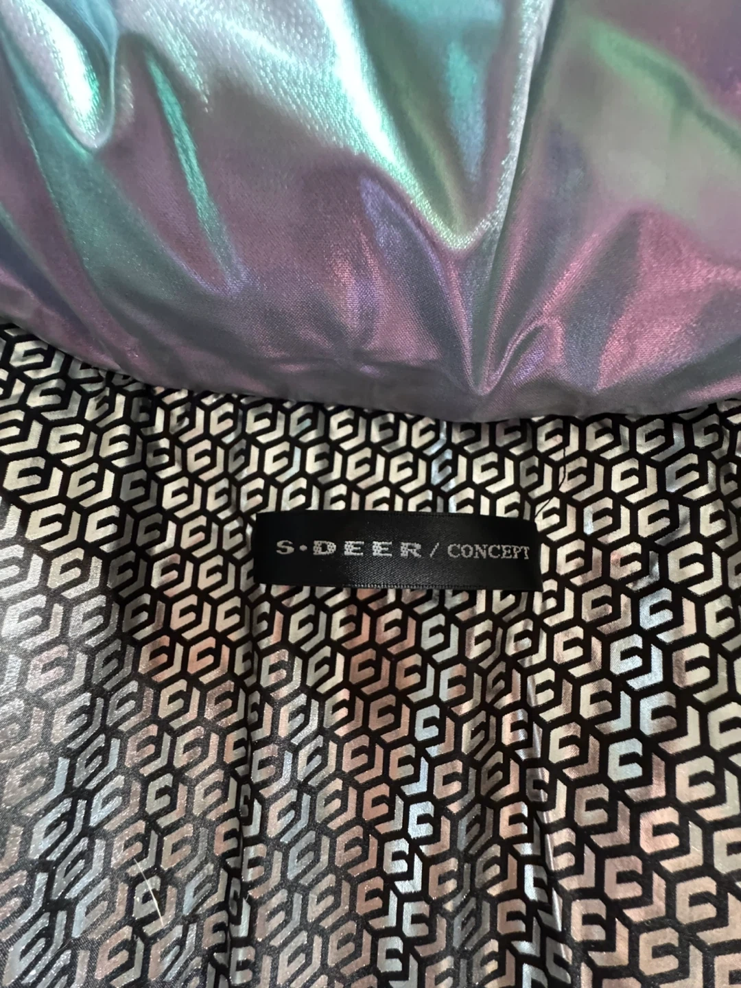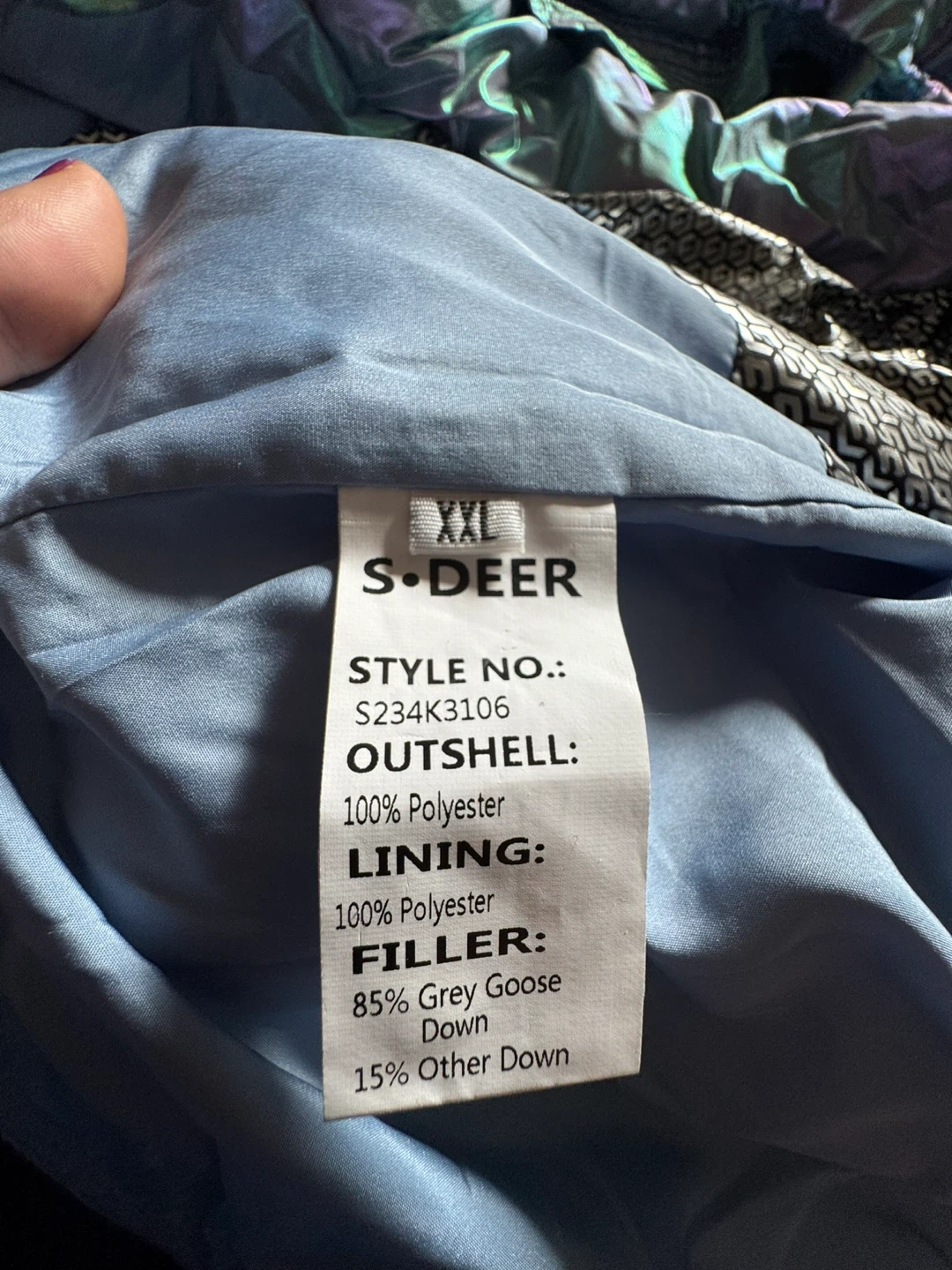 This S.DEER CONCEPT puffer jacket is a size XXL. It features a holographic outer shell and a patterned lining. The filler is 85% Grey Goose Down and 15% other down. It's great for staying warm in colder weather!