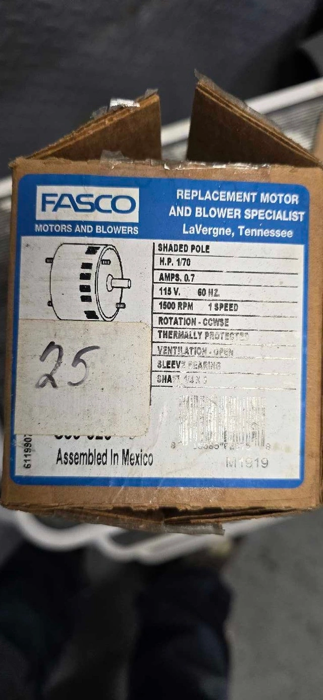 This is a new Fasco motor, model number 670, suitable as a replacement motor and blower specialist. It runs at 15 V, 60 Hz, and 1600 RPM, and is thermally protected. Specifications: Volts: 15V, Hertz: 60Hz, RPM: 1600, Thermally Protected. If the ad is up, the item is available.