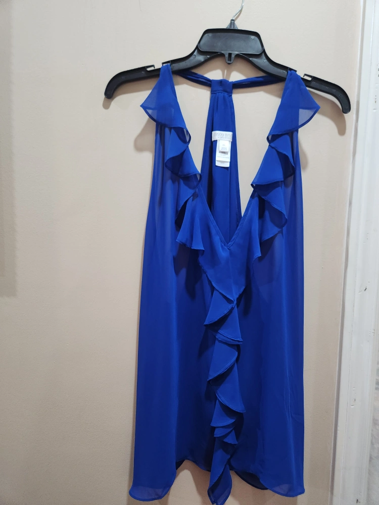 Beautiful royal blue halter top. Features ruffles along the neckline and cascading down the front. Lightweight and flowy fabric. Size: XL