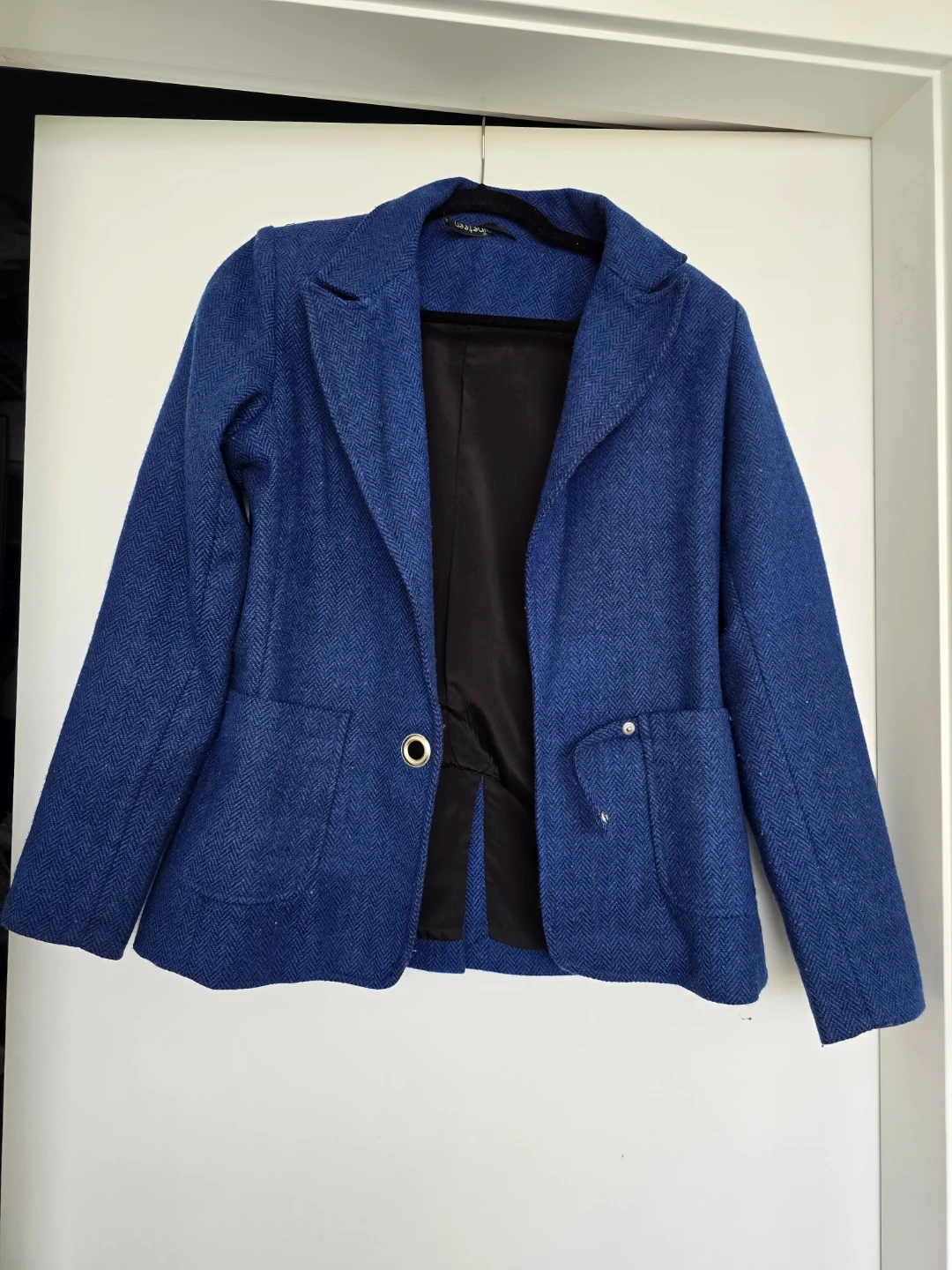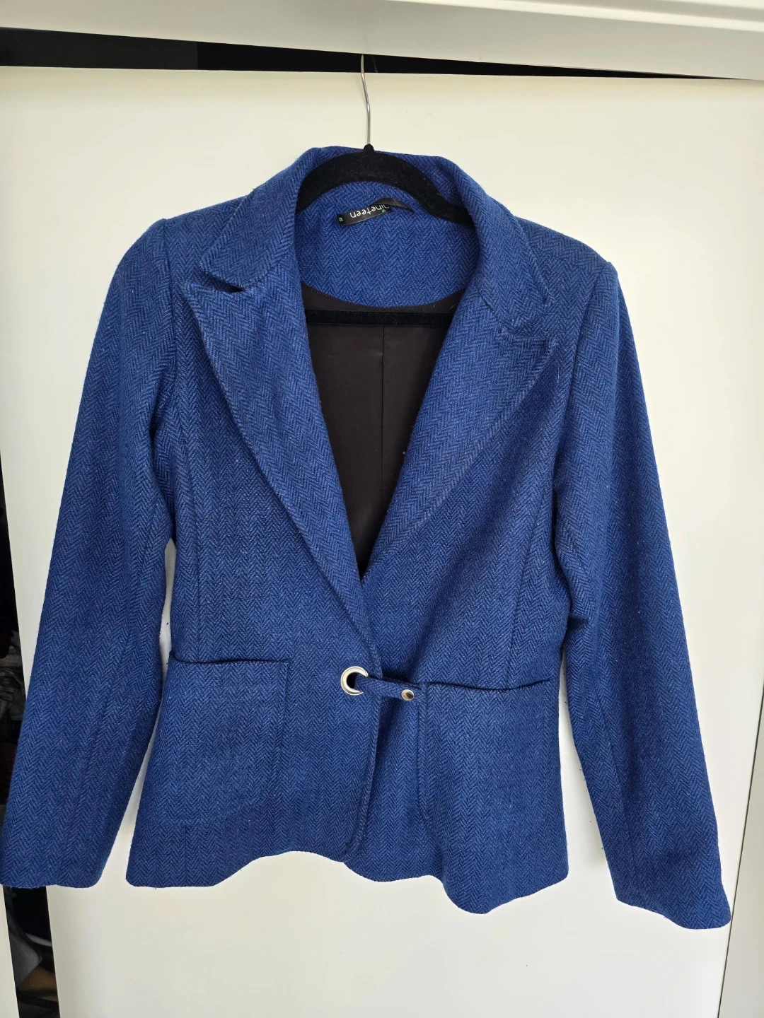 A stylish blue blazer with a subtle herringbone pattern. It features a single button closure and two front pockets with decorative hardware. Fully lined inside for a clean finish.