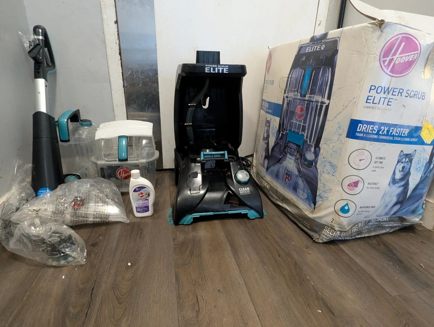 This is a Hoover Power Scrub Elite carpet cleaner. It comes with various attachments and a bottle of cleaning solution. It's designed for deep cleaning carpets and dries quickly.