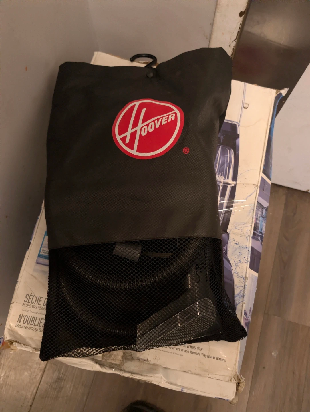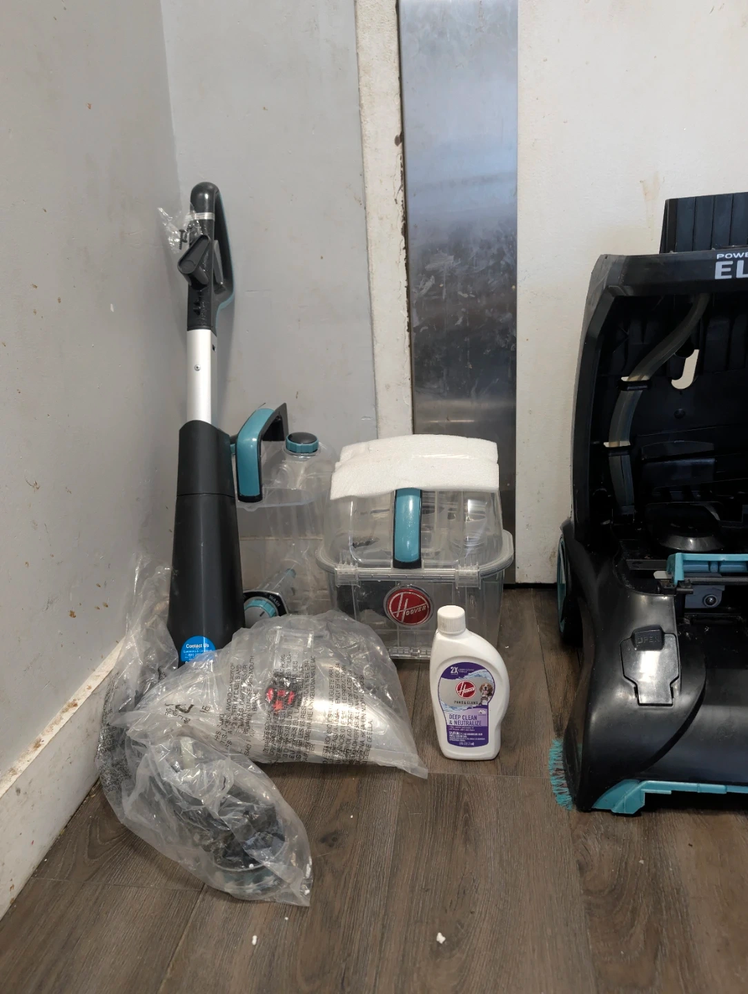 This is a Hoover Power Scrub Elite carpet cleaner. It comes with various attachments and a bottle of cleaning solution. It's designed for deep cleaning carpets and dries quickly.