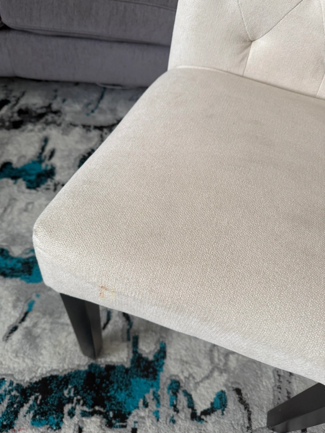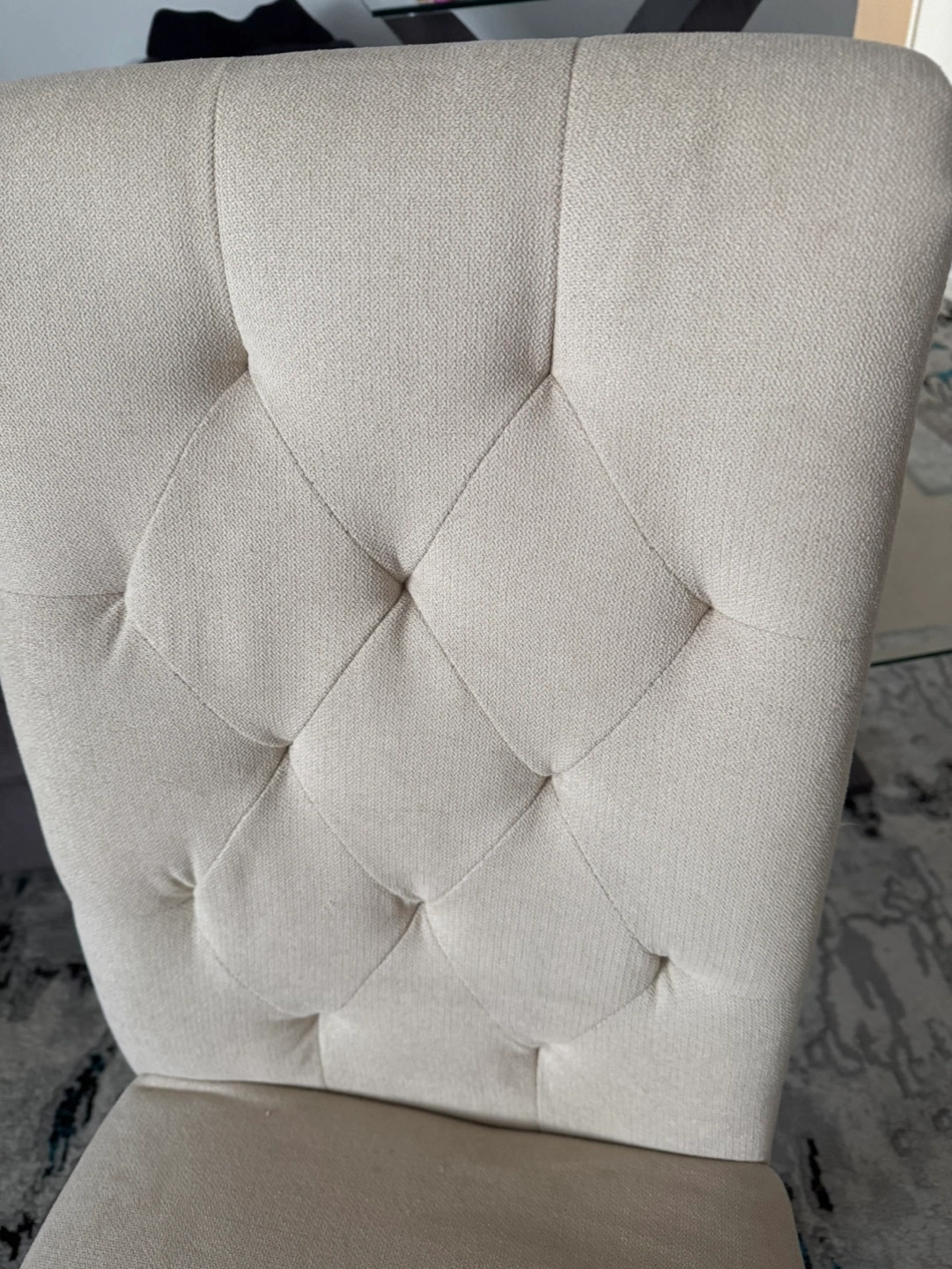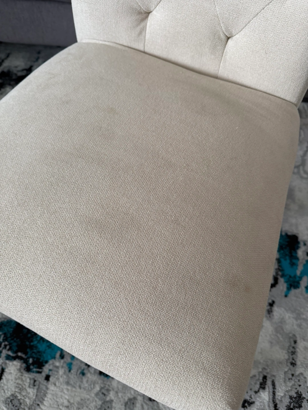 Cream coloured fabric chair. Button tufted backrest and seat. Dark brown legs. Minor wear visible. AS IS. I HAVE TWO AVAILABLE