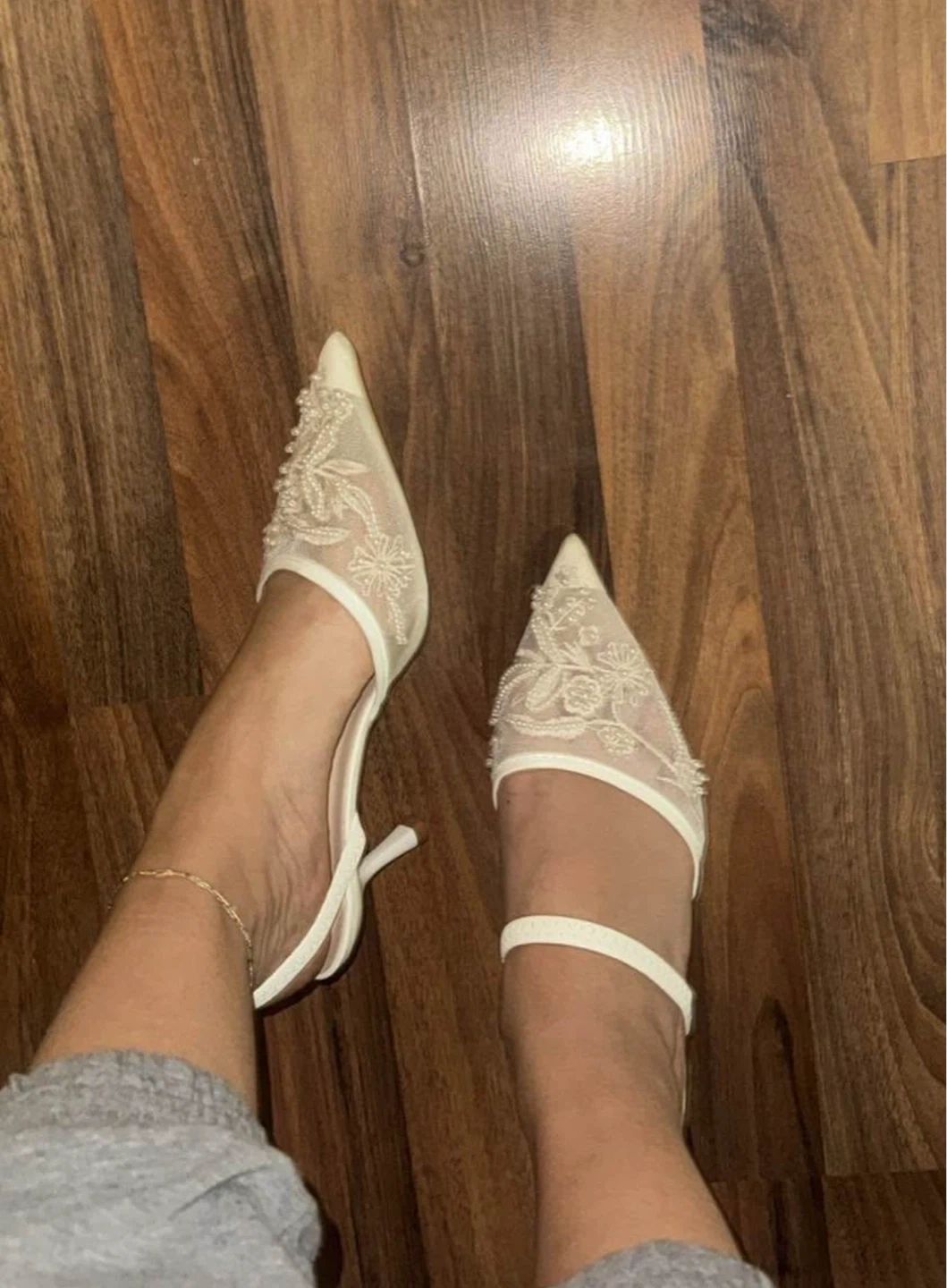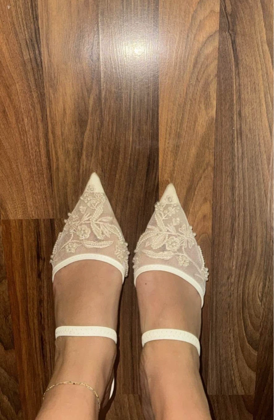 Off-white lace pointed-toe heels with delicate pearl embellishments and an ankle strap for a secure fit.