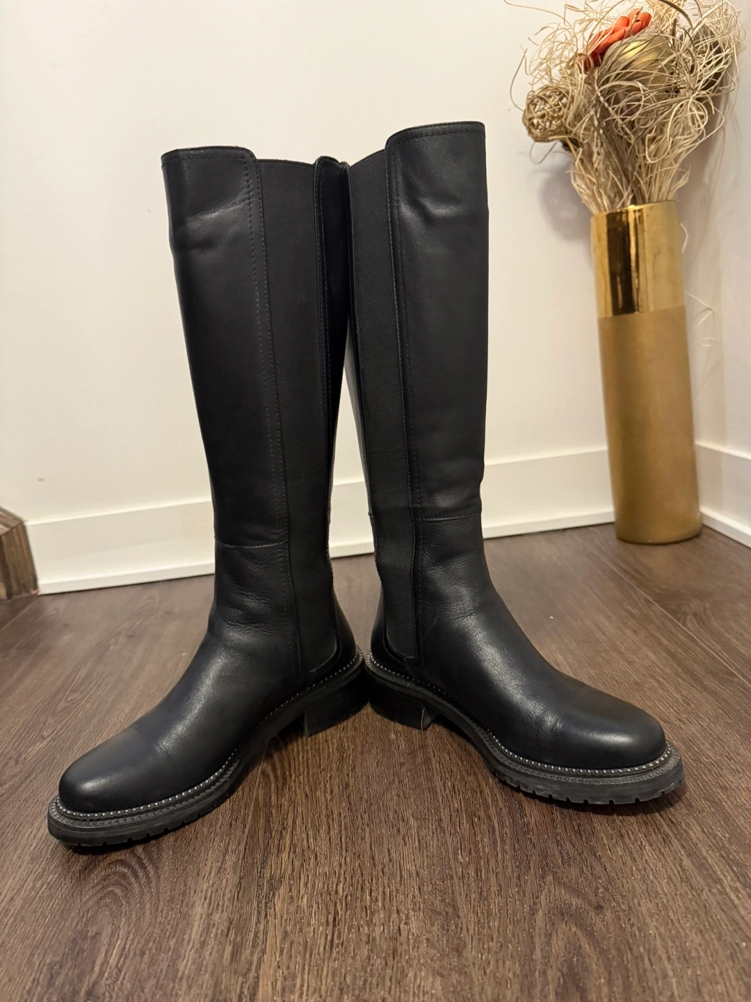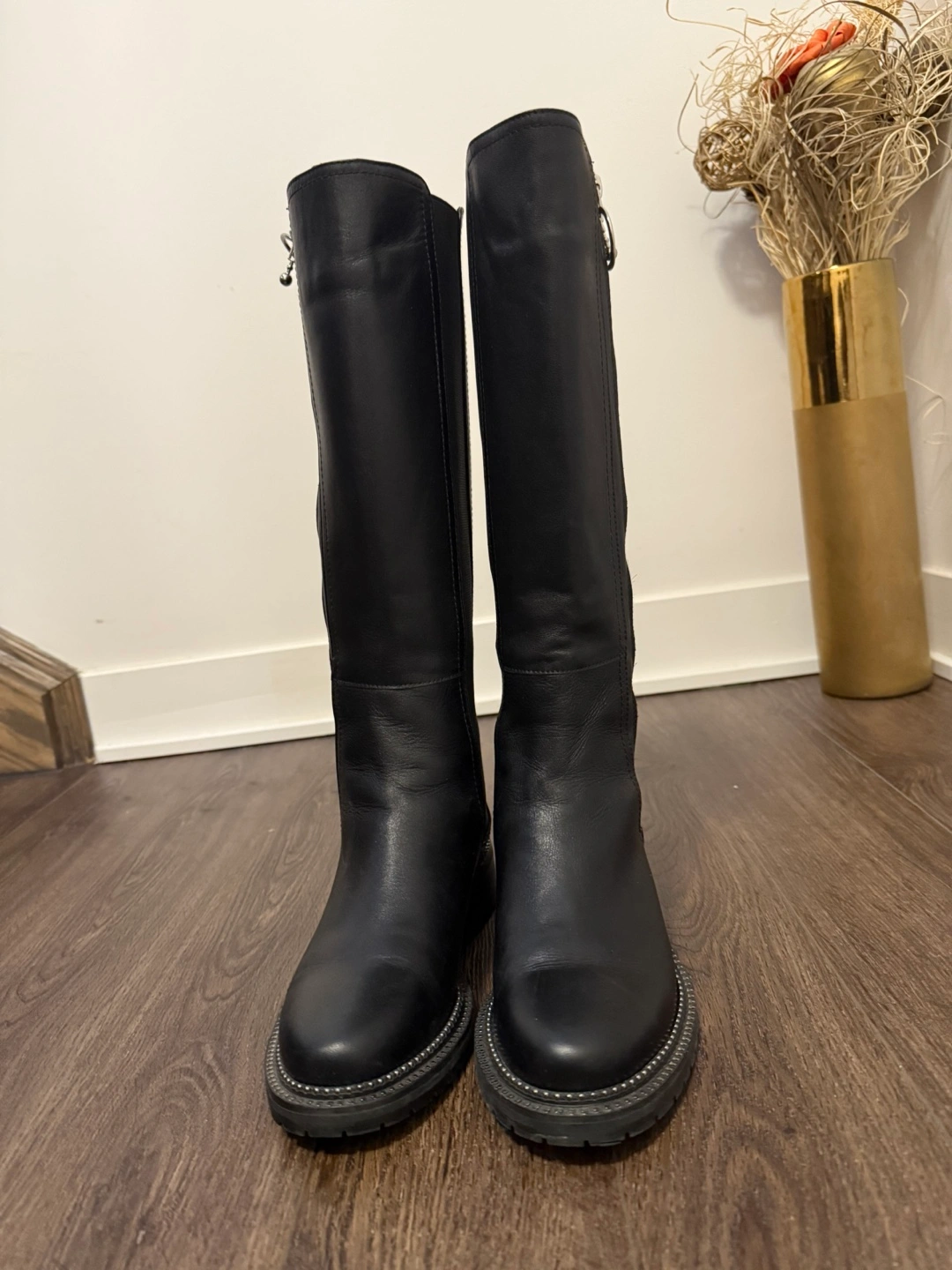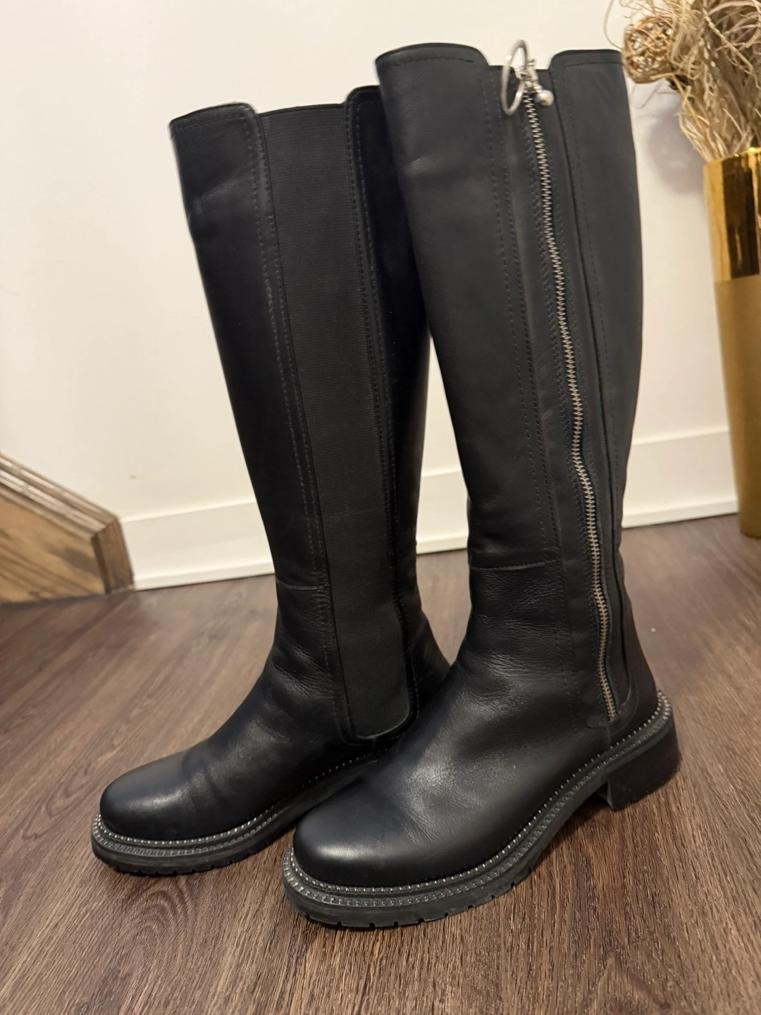 Women's black real leather knee-high boots. Side zip closure. Low block heel. Studded sole detail. Excellent condition. Only selling it b/c my calves are too big.