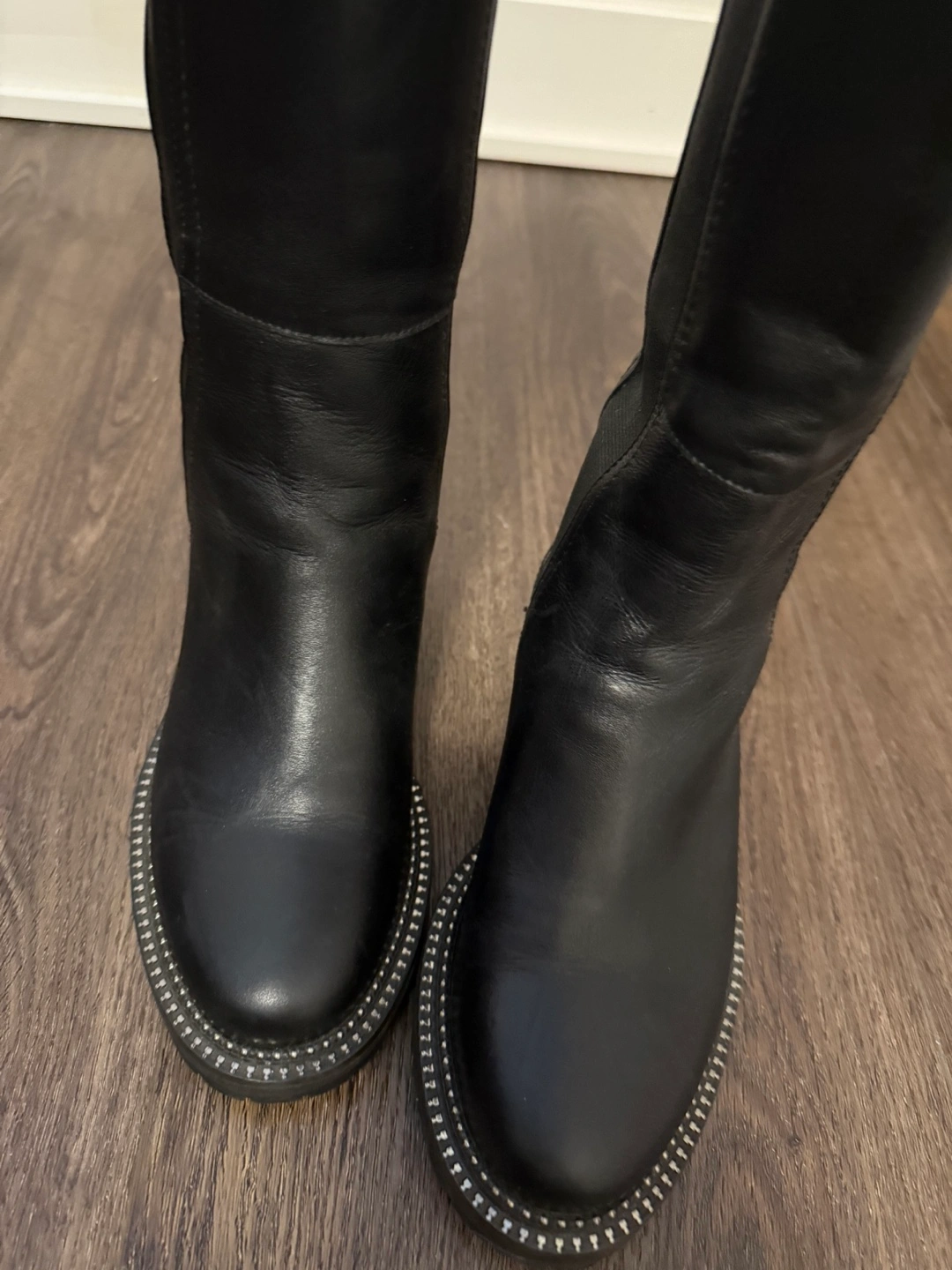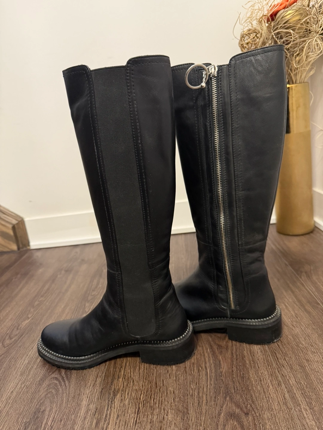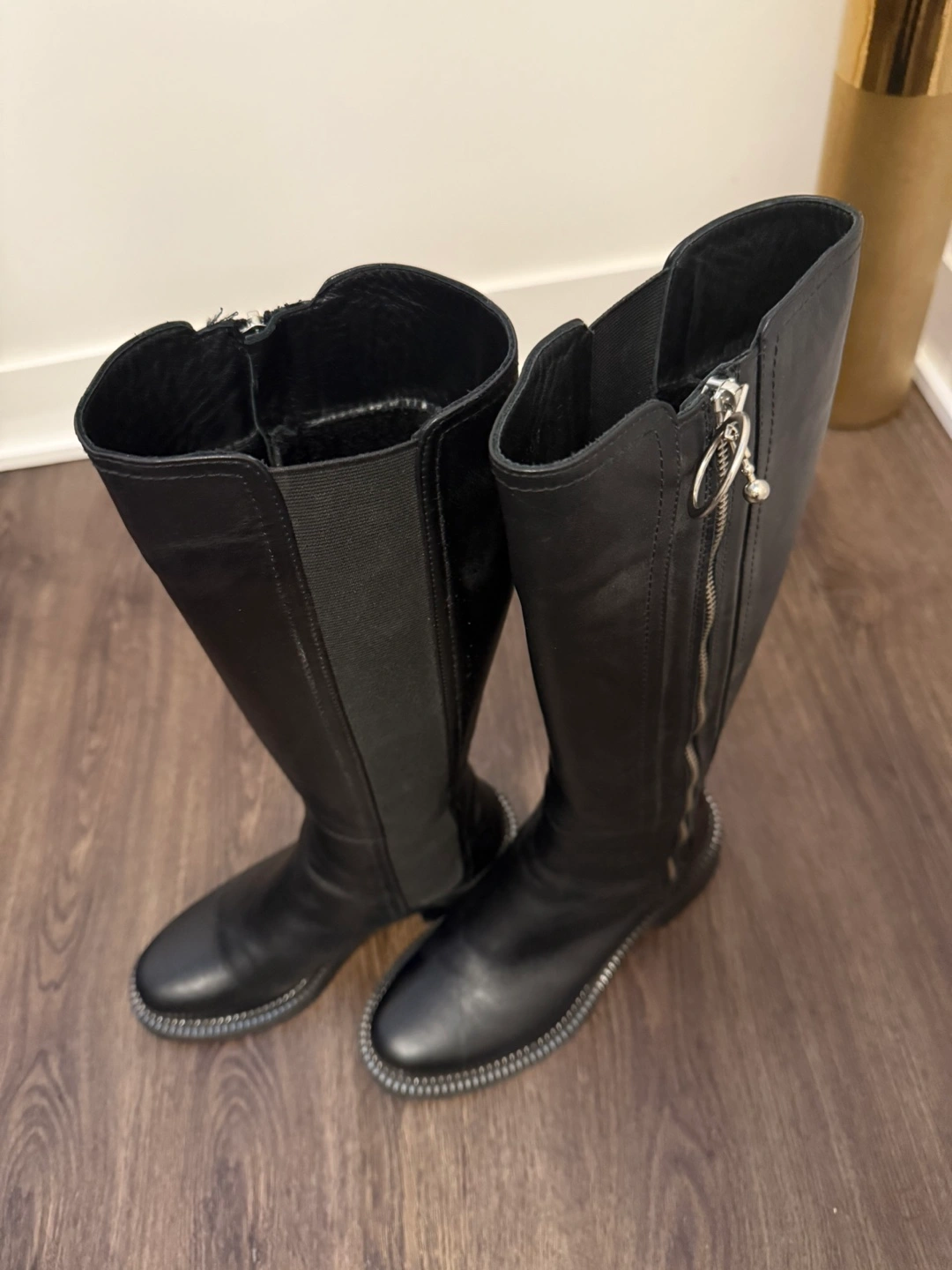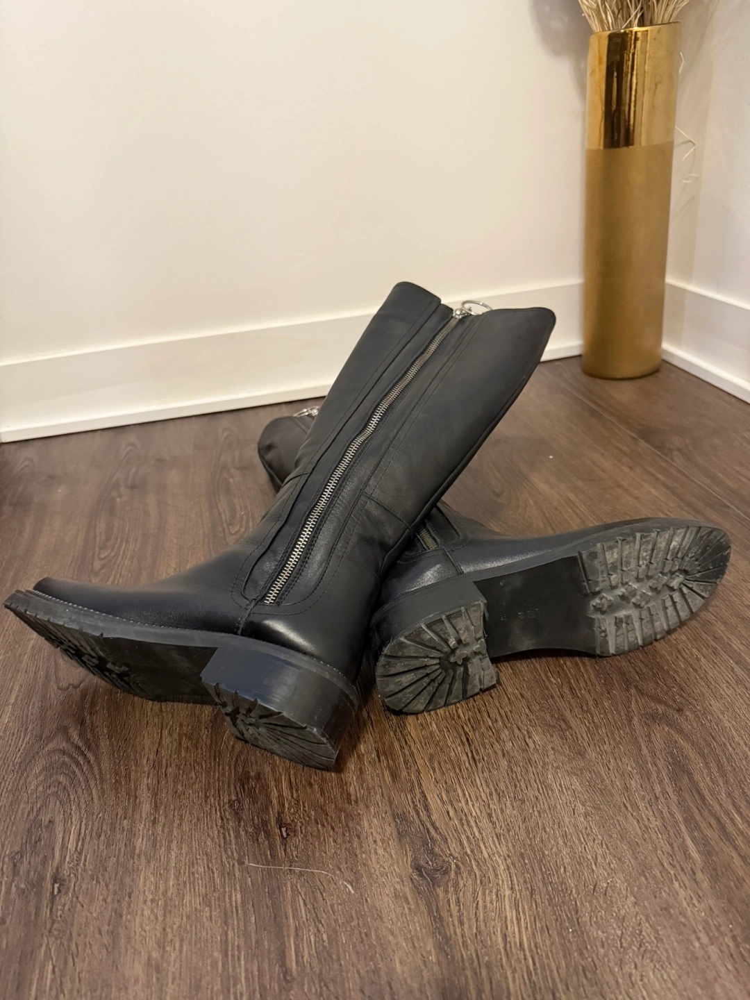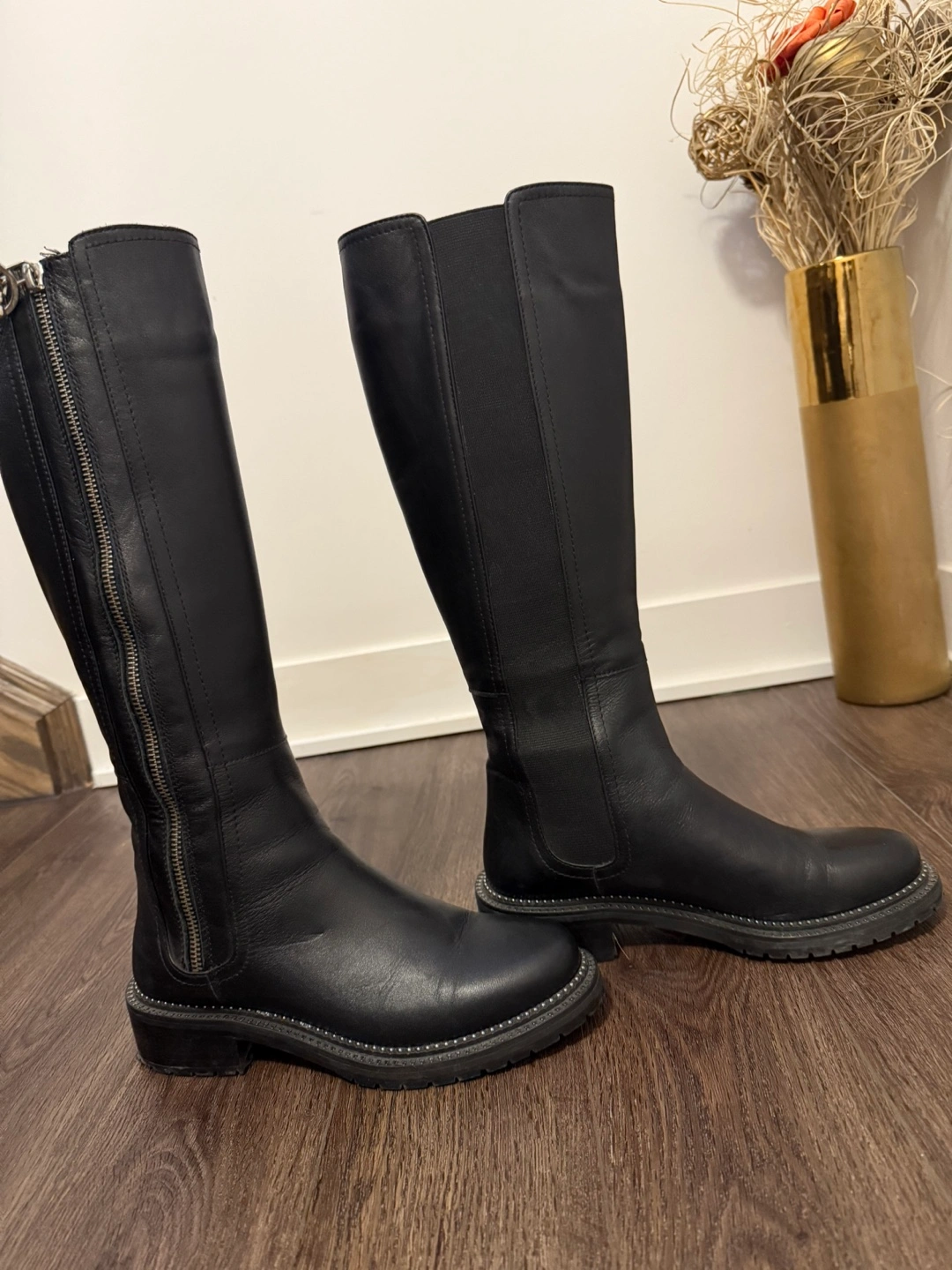 Women's black real leather knee-high boots. Side zip closure. Low block heel. Studded sole detail. Excellent condition. Only selling it b/c my calves are too big.