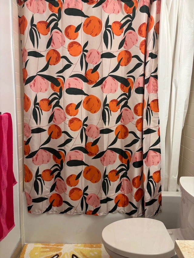 Add a touch of whimsy to your bathroom with this brand new shower curtain, featuring a delightful and vibrant fruit design. This curtain is made from high-quality, water-resistant fabric, ensuring durability and easy maintenance. The fun and colourful pattern will brighten up your space. This shower curtain is in new condition and ready to hang. Why not add some zest to your morning routine? If the ad is up, it's still available! Specifications: - Material: Water-resistant fabric - Design: Fruit design - Condition: New - Dimensions: Standard size. Cash accepted.