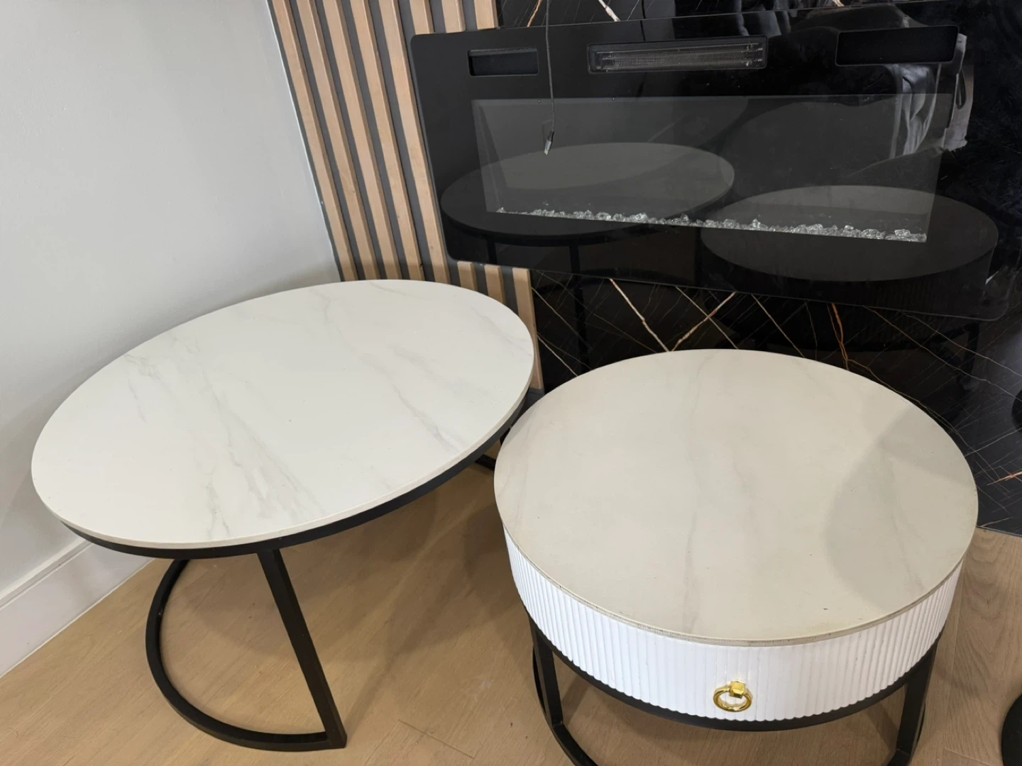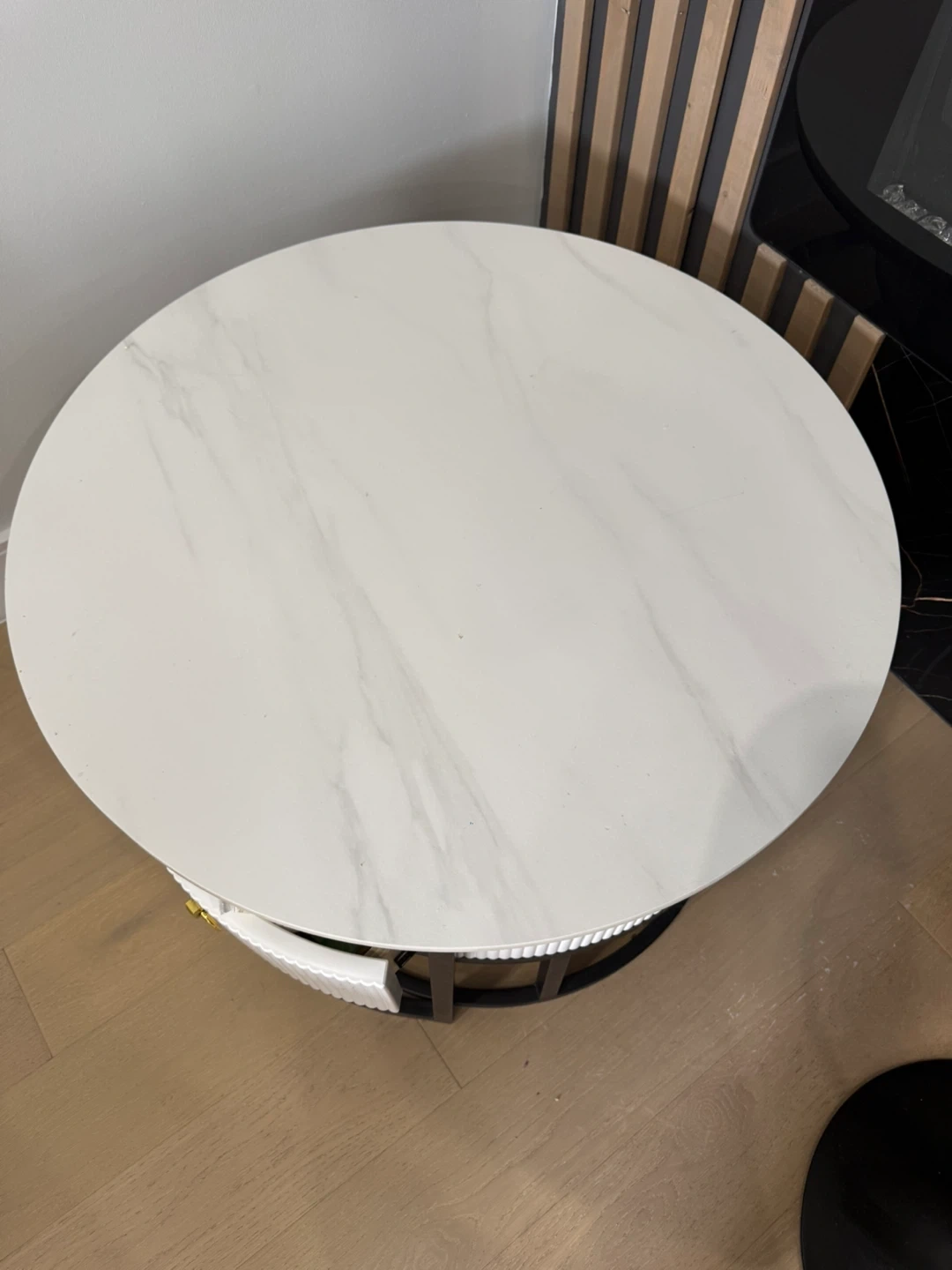 White marble-look round end table with a built-in drawer. It features a fluted design on the drawer base and a gold-toned pull. Tabletop is white with grey veining. Metal frame.