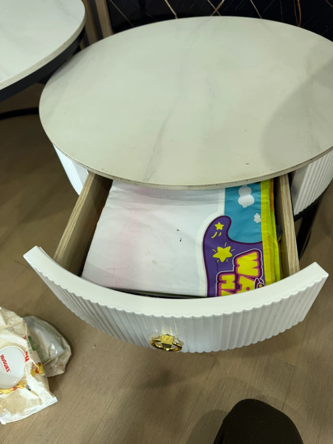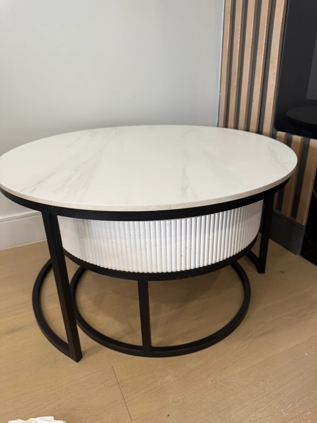White marble-look round end table with a built-in drawer. It features a fluted design on the drawer base and a gold-toned pull. Tabletop is white with grey veining. Metal frame.
