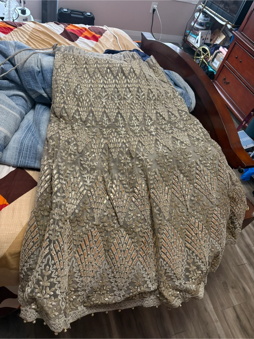 This is an embroidered skirt and blouse set. The skirt features intricate gold leaf patterns on a grey net fabric. The sleeveless blouse is made of a satin-like material with matching embellishments. It's suitable for special occasions.