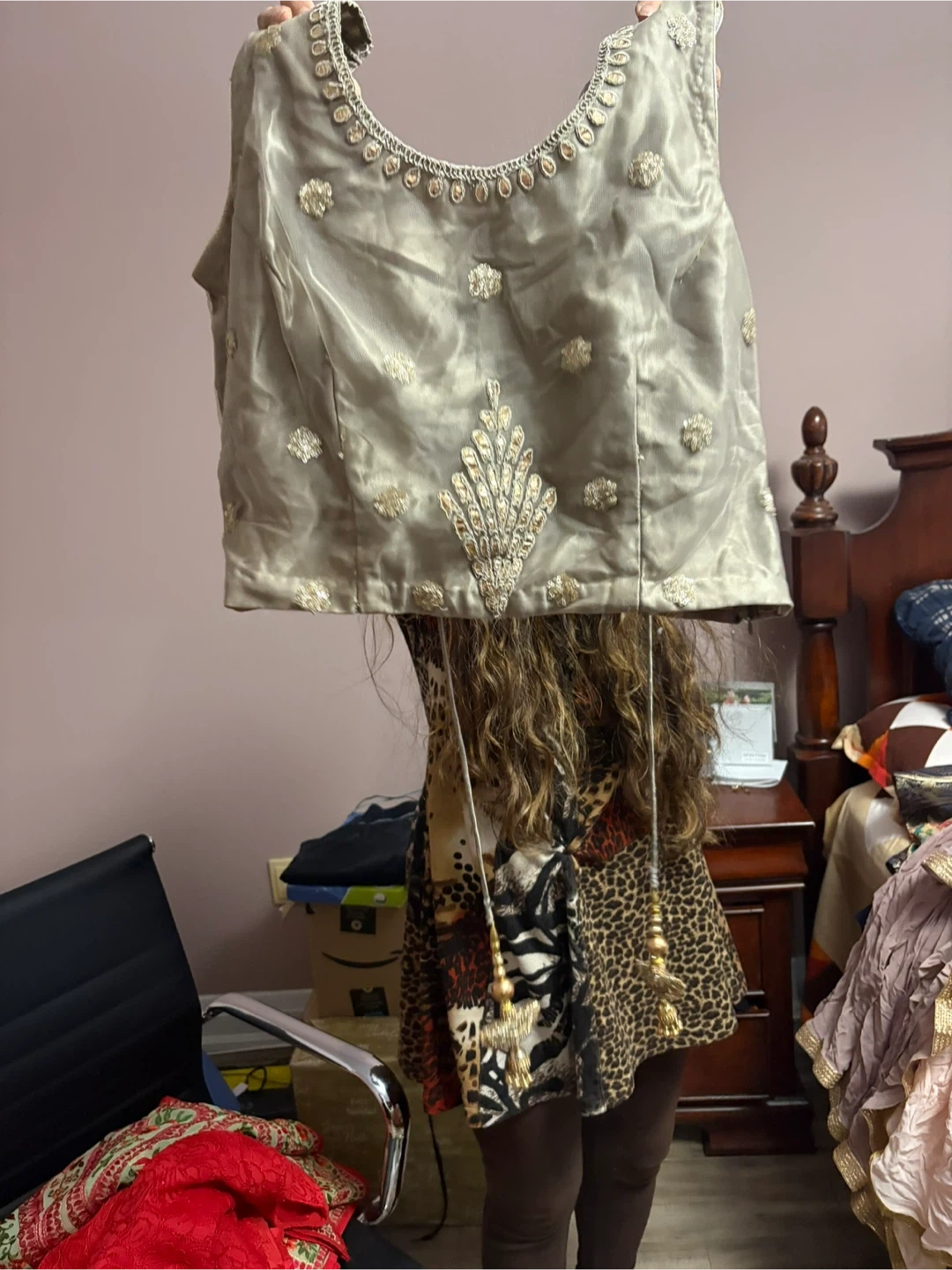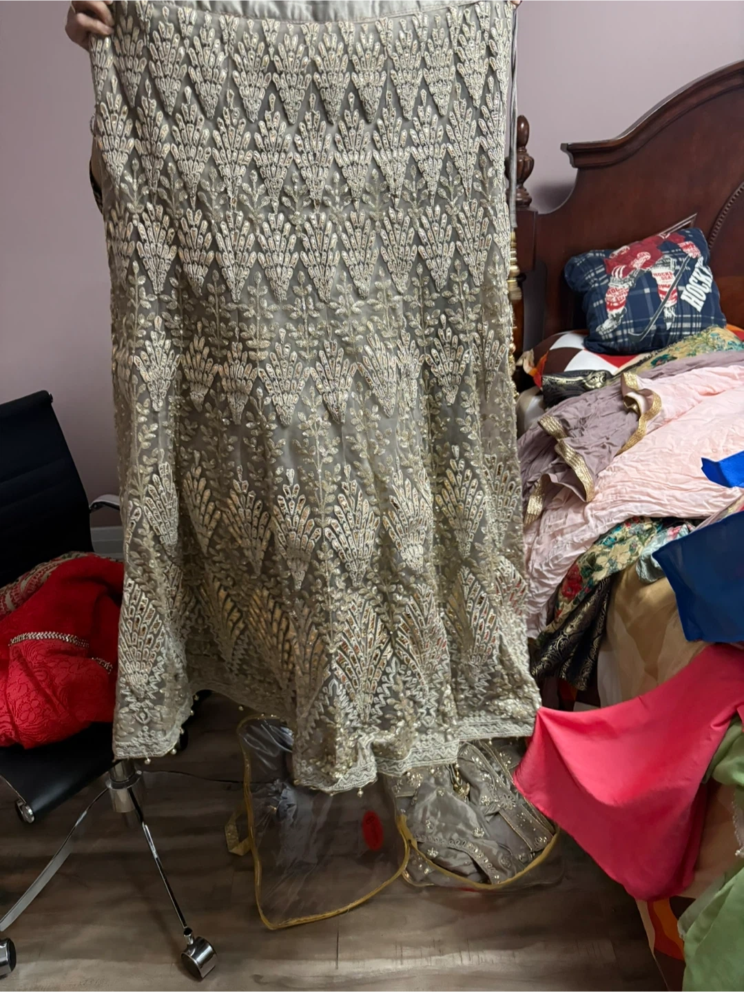 This is an embroidered skirt and blouse set. The skirt features intricate gold leaf patterns on a grey net fabric. The sleeveless blouse is made of a satin-like material with matching embellishments. It's suitable for special occasions.