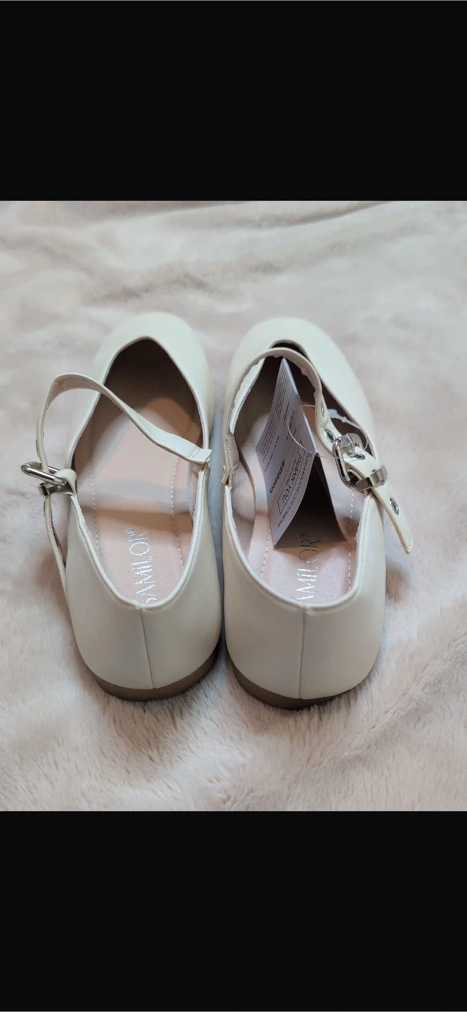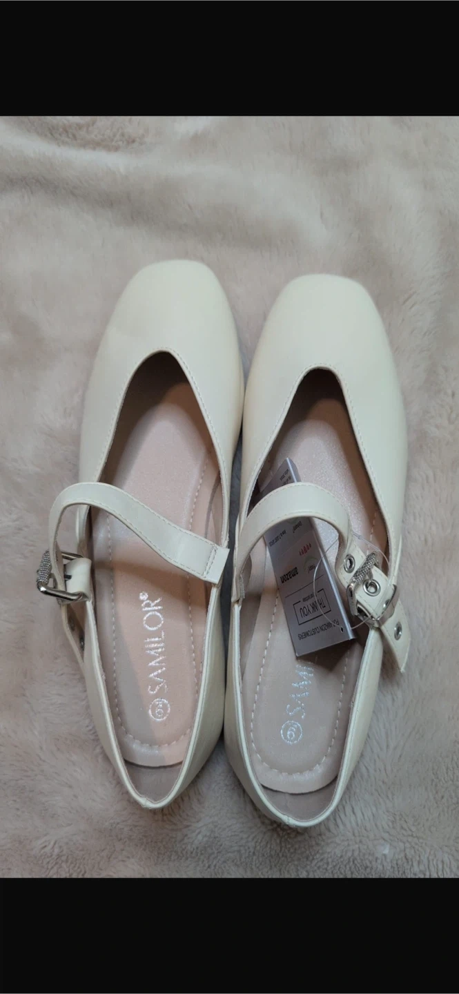 New! Samilor women's Mary Jane flats in a cream colour. Features memory foam insoles and abrasion-resistant material. The strap has an adjustable silver buckle closure.