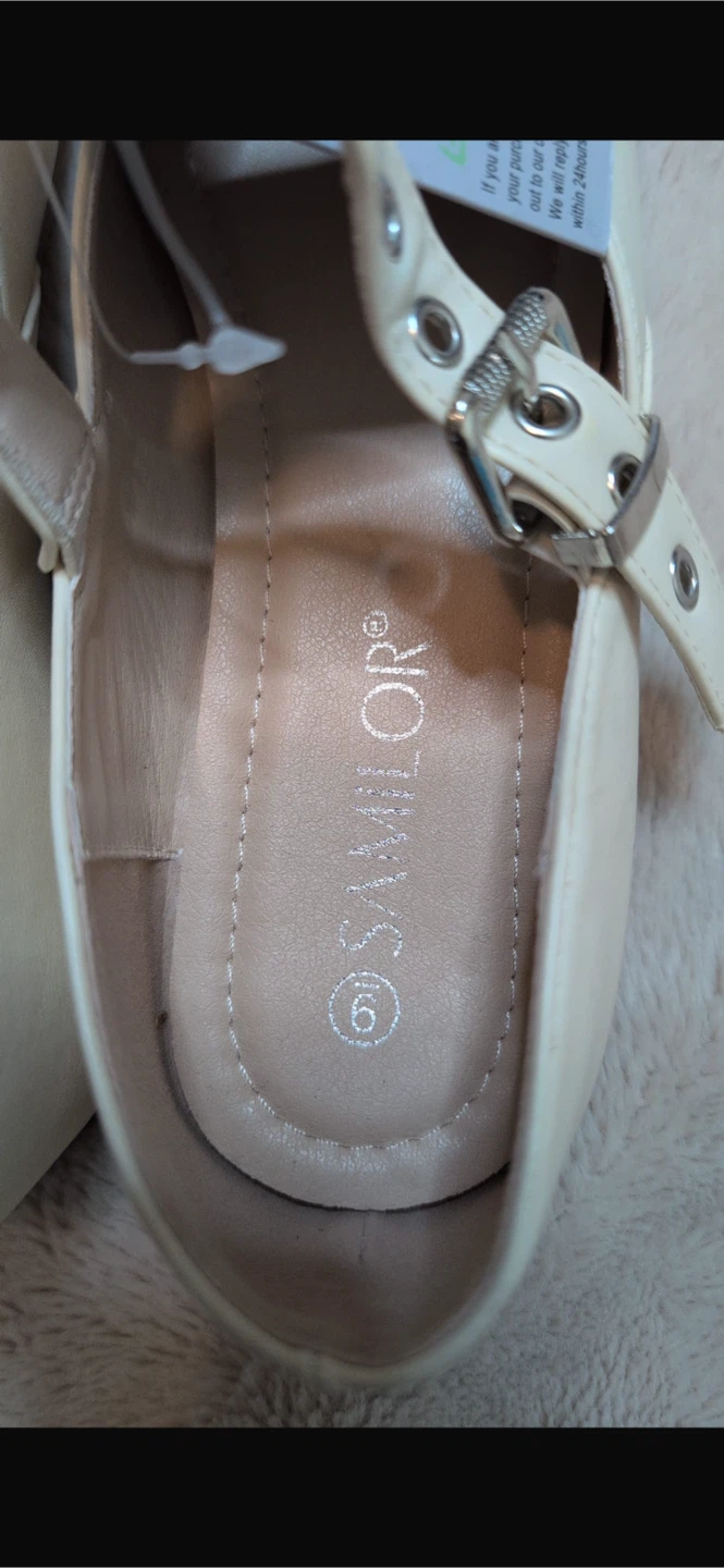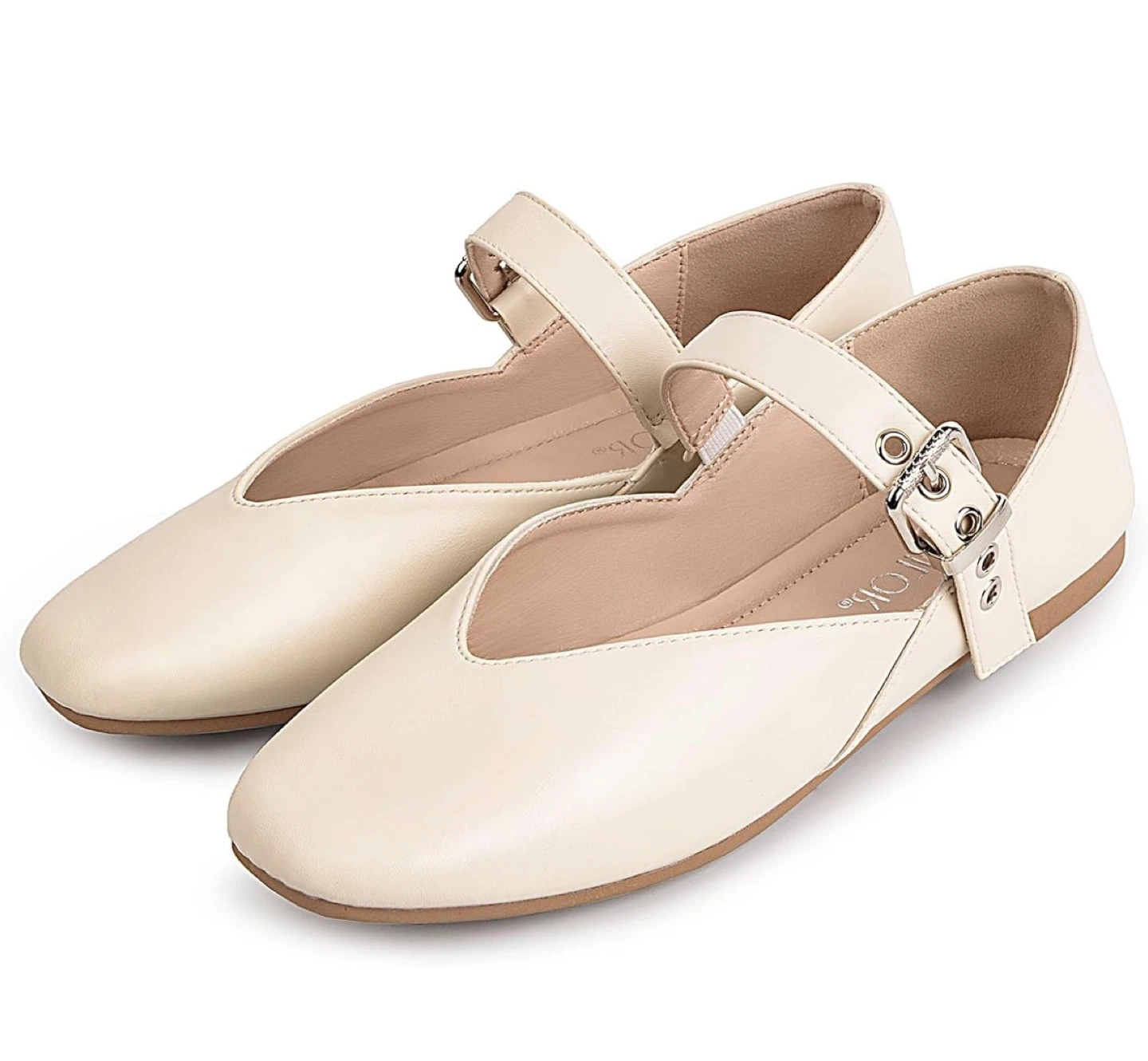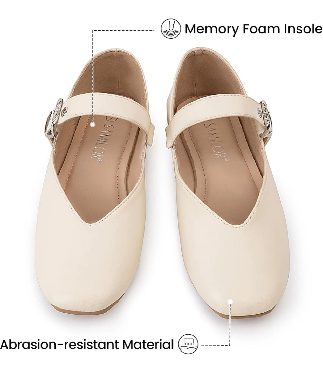 New! Samilor women's Mary Jane flats in a cream colour. Features memory foam insoles and abrasion-resistant material. The strap has an adjustable silver buckle closure.