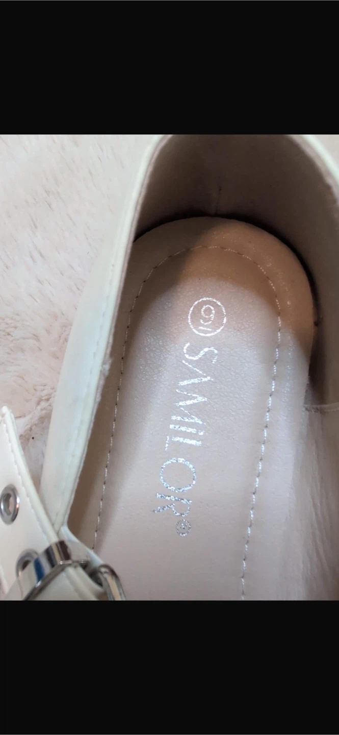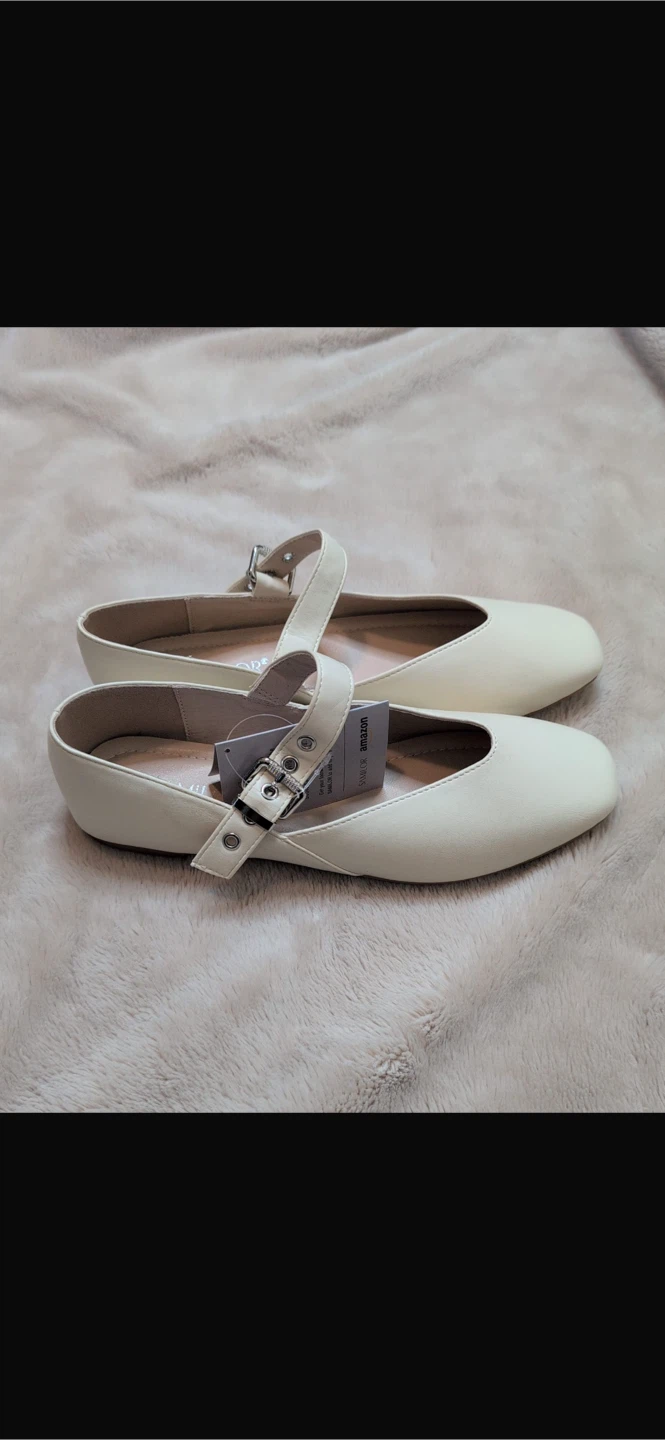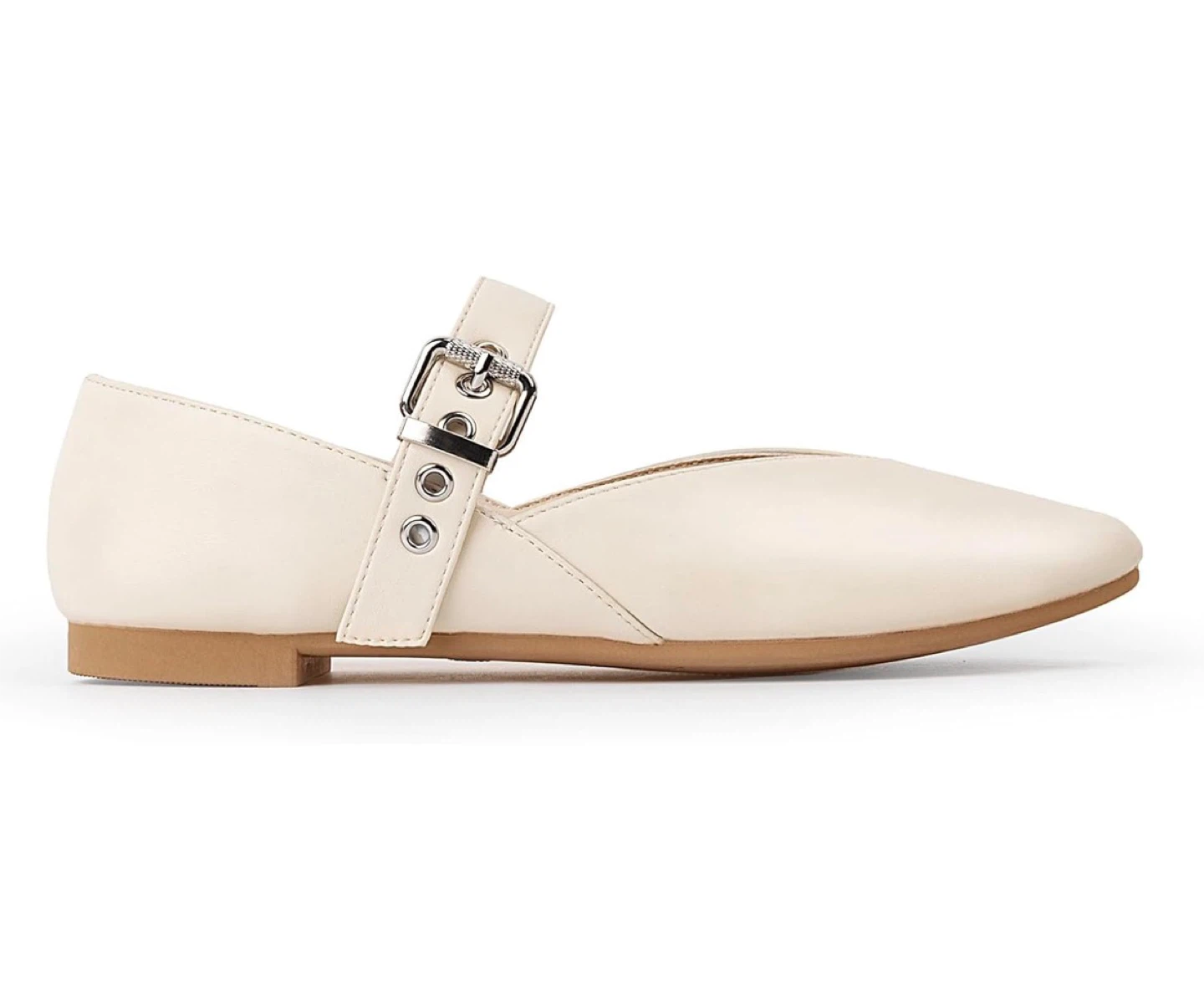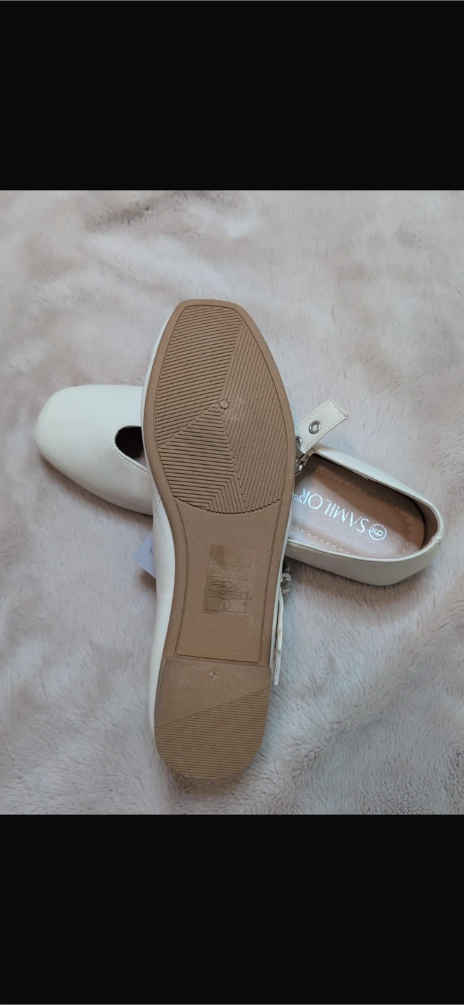 New! Samilor women's Mary Jane flats in a cream colour. Features memory foam insoles and abrasion-resistant material. The strap has an adjustable silver buckle closure.