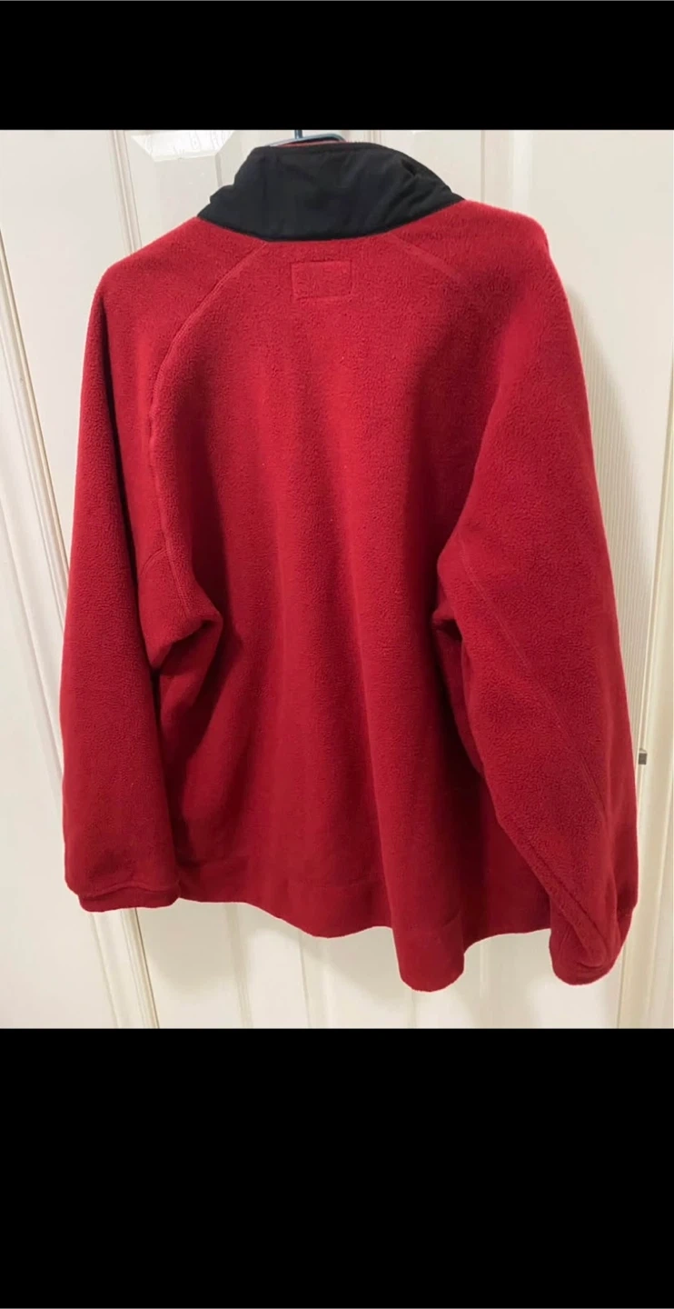 This red fleece jacket from Roots is a cozy mid-layer. It features a full zip front and a black collar. Made from soft fleece material.