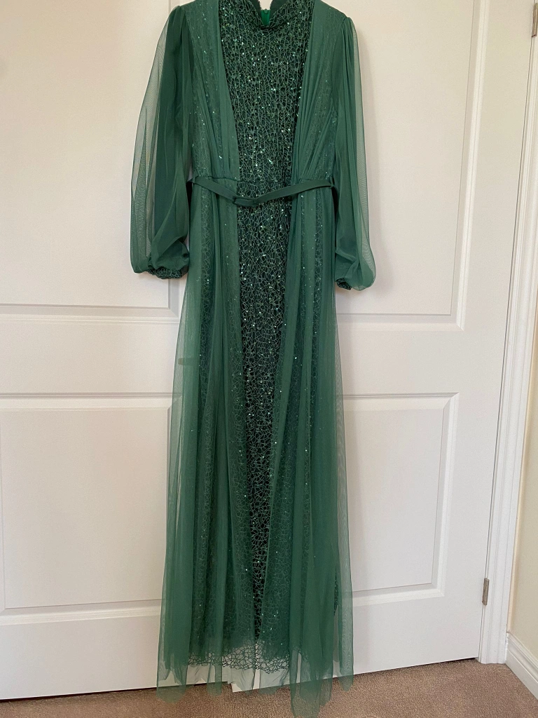 The long dress has a lovely green hue. The dress has a long, flowing style. Features a high neckline. An excellent dress for a fancy gathering, so you can look and feel your best. Includes a matching belt.