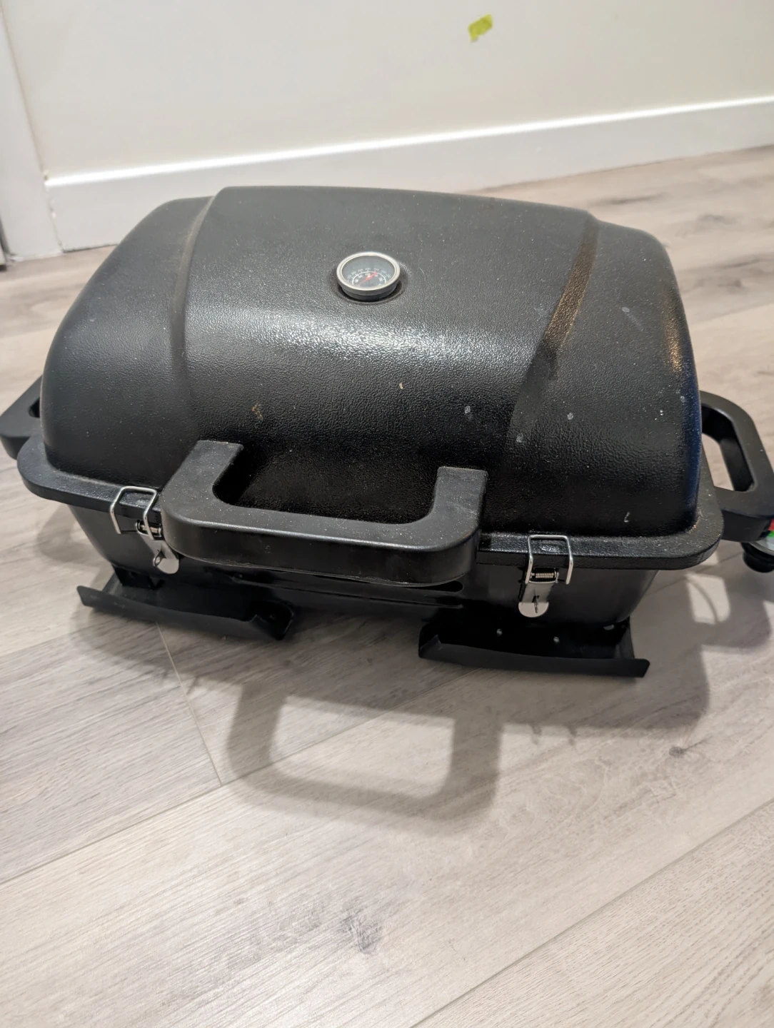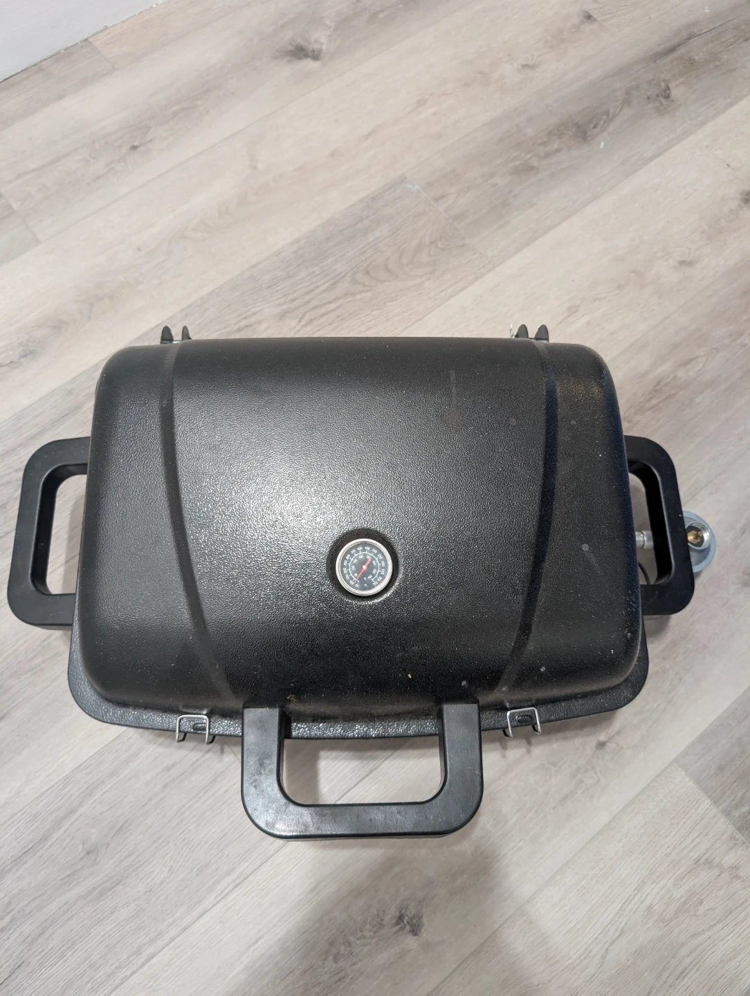 This is a portable black BBQ grill. It features a built-in thermometer and folding legs for easy transport. Black plastic and metal construction.