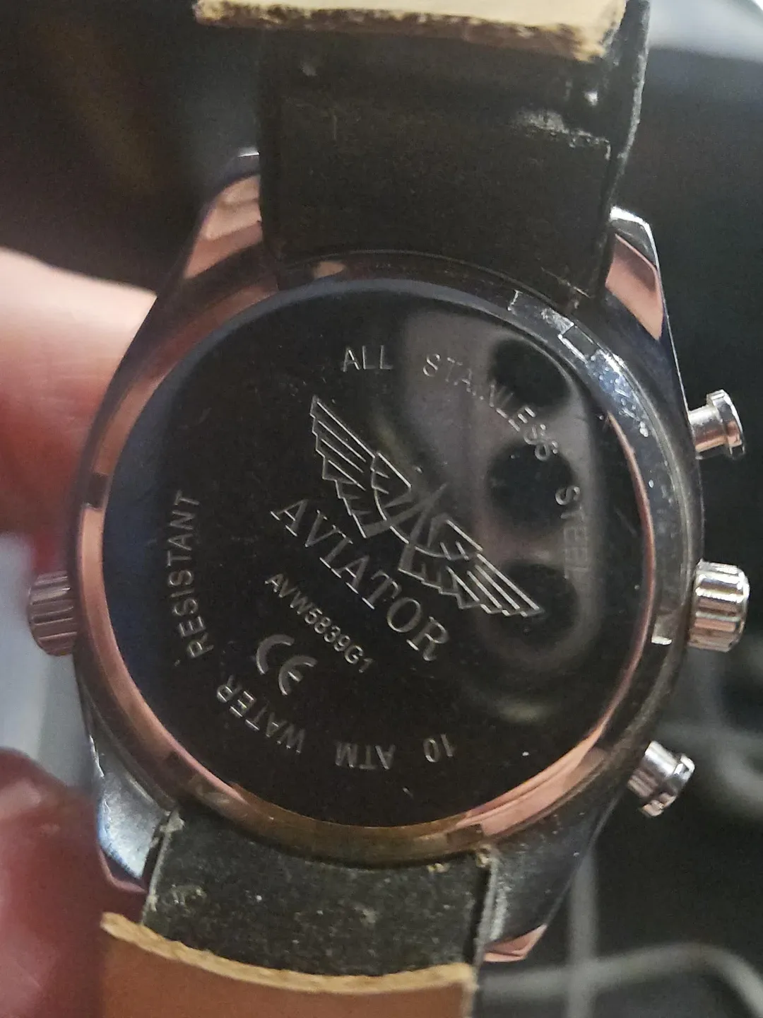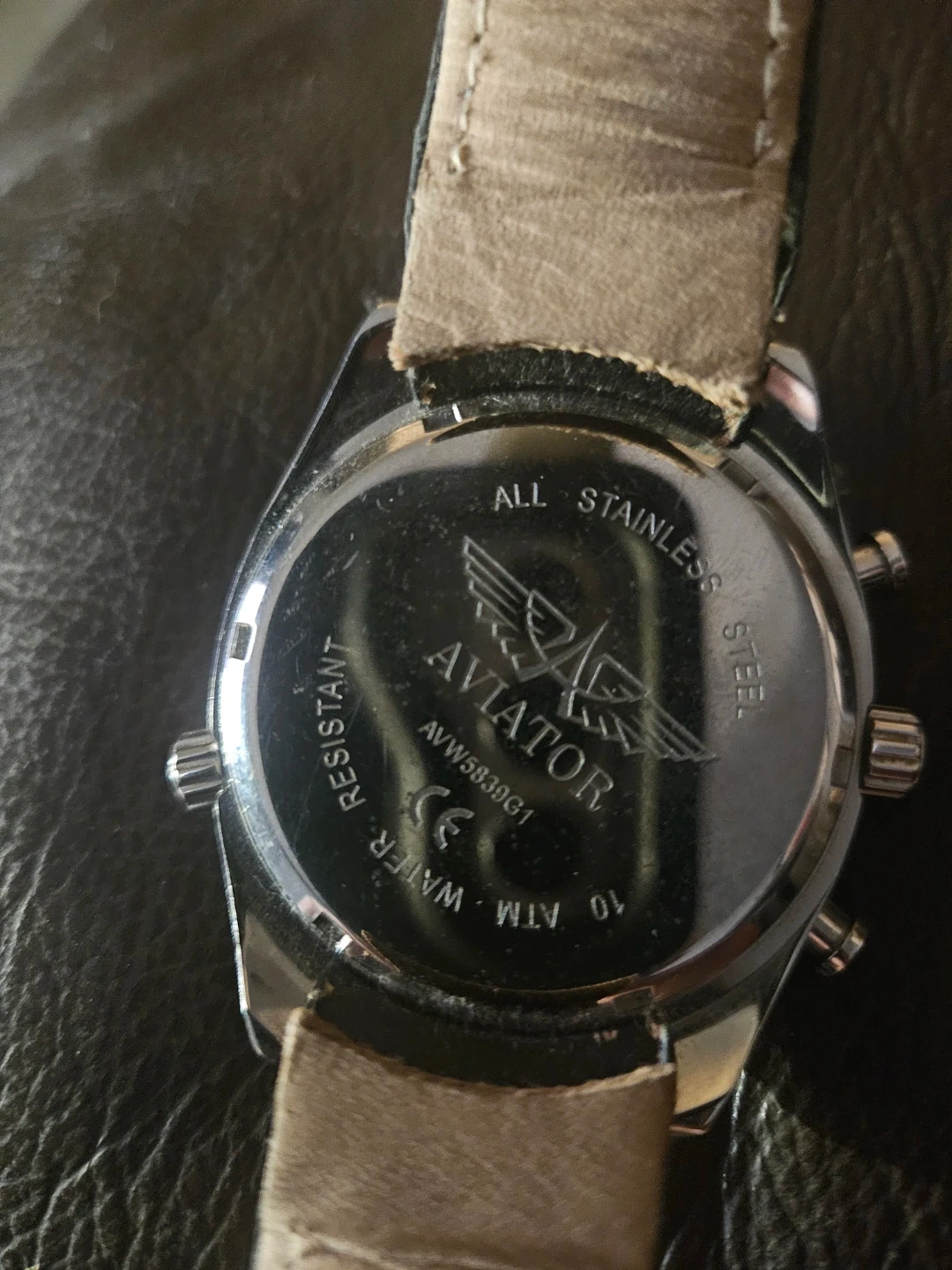 Selling an Aviator watch, model AVW5839G1. It has a black face and a leather band. The back of the watch indicates it is water resistant and made of stainless steel