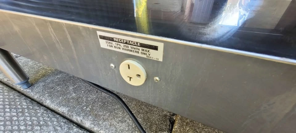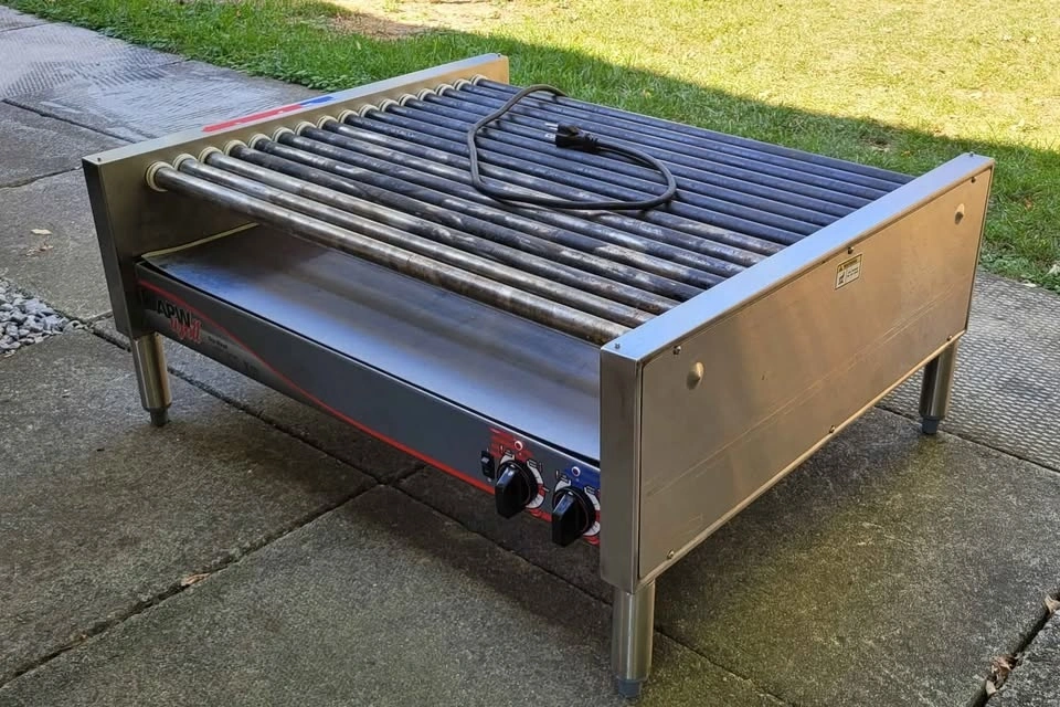 APW Wyott HRS-75 Electric Hot Dog Roller Grill, 75 Capacity. Heating system has two cooking zones. Cooks hot dogs in less than 4 minutes*. Grill time based on pre-heated roller grill (about 10 minute warm-up cycle). 30 1/2" wide cooking surface with 16 Tru-Turn Surface rollers. Easy to read graphics, heavy duty infinite control knobs. Designed to require minimal labor. Removable grease collection pan. Raised rollers allow cleaning in hard to reach areas. Easy to remove side and bottom panels. Dependable, high torque motor. Stainless steel construction. Has one weak roller but still works excellent. Retail Price: $5,256.00. Price $175.00