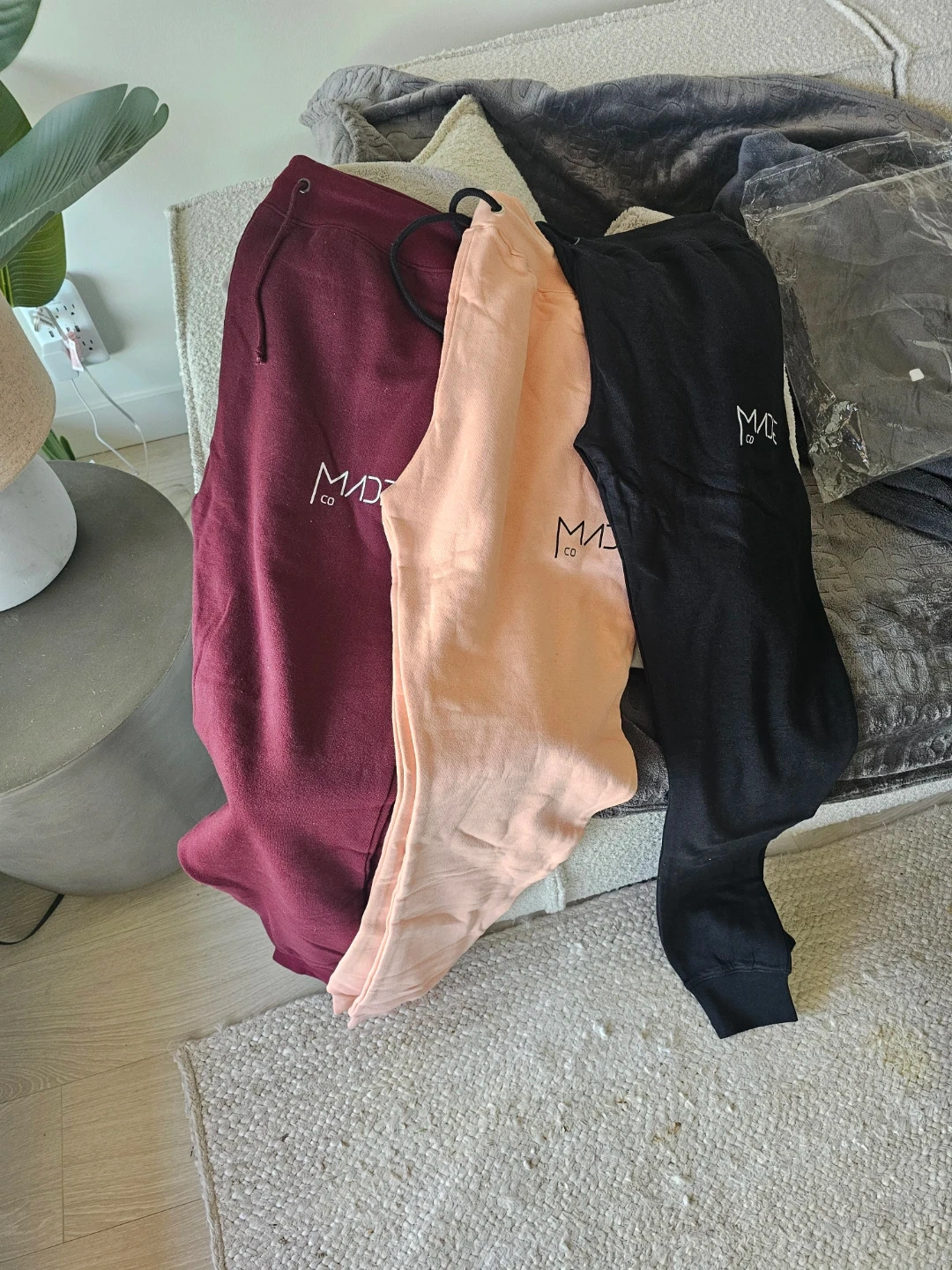 Three pairs of MAD CO joggers in burgundy, peach, and black. These bottoms are made from a soft material for comfort. They're great for lounging or casual wear.