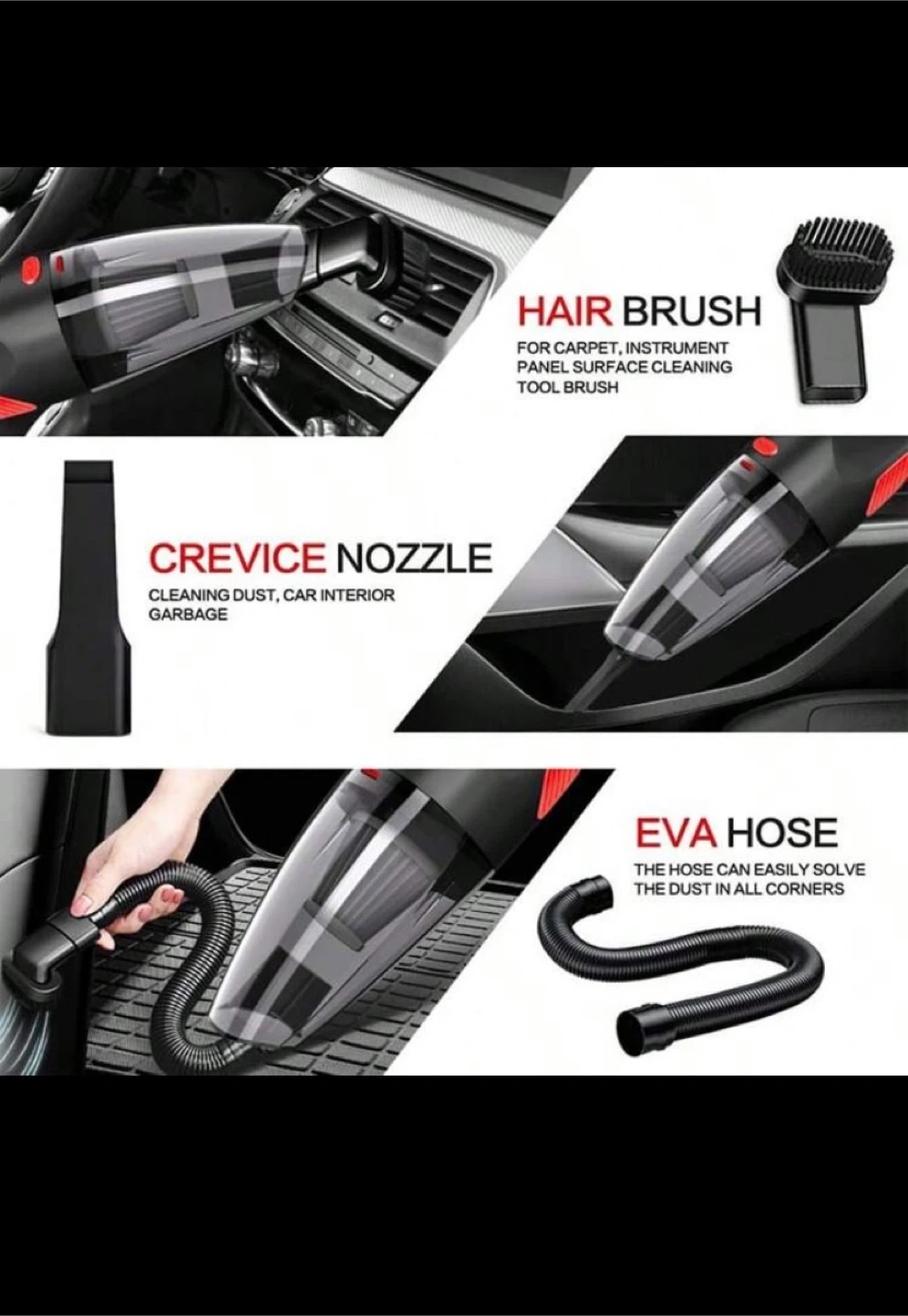 This cordless vacuum cleaner is great for cars and homes. It comes with multiple attachments including a crevice nozzle, a brush, and a hose. It's powered by a rechargeable battery and includes a USB charging cable.