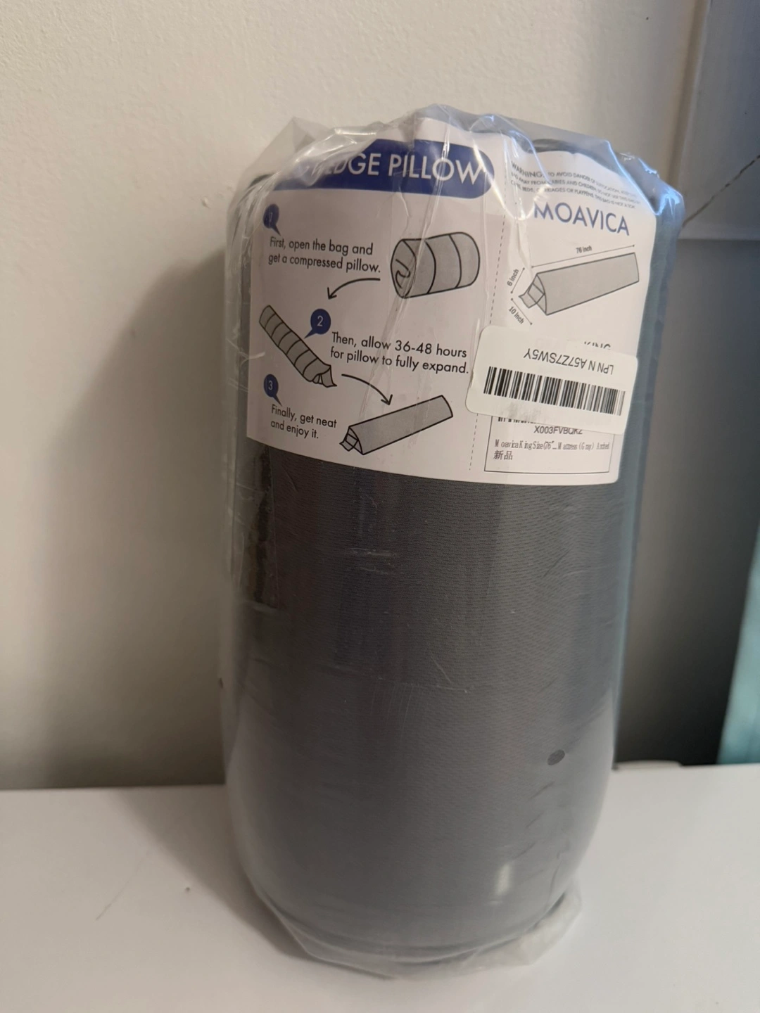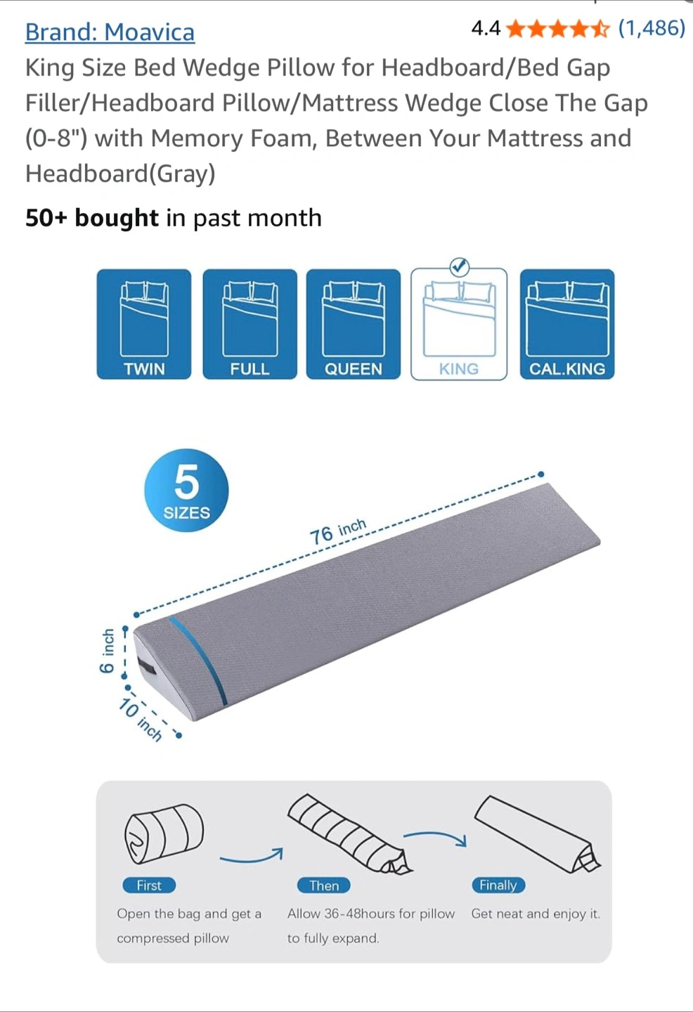 King size bed wedge pillow. Memory foam. Fills gap between headboard and mattress. Gray. Expands after opening.