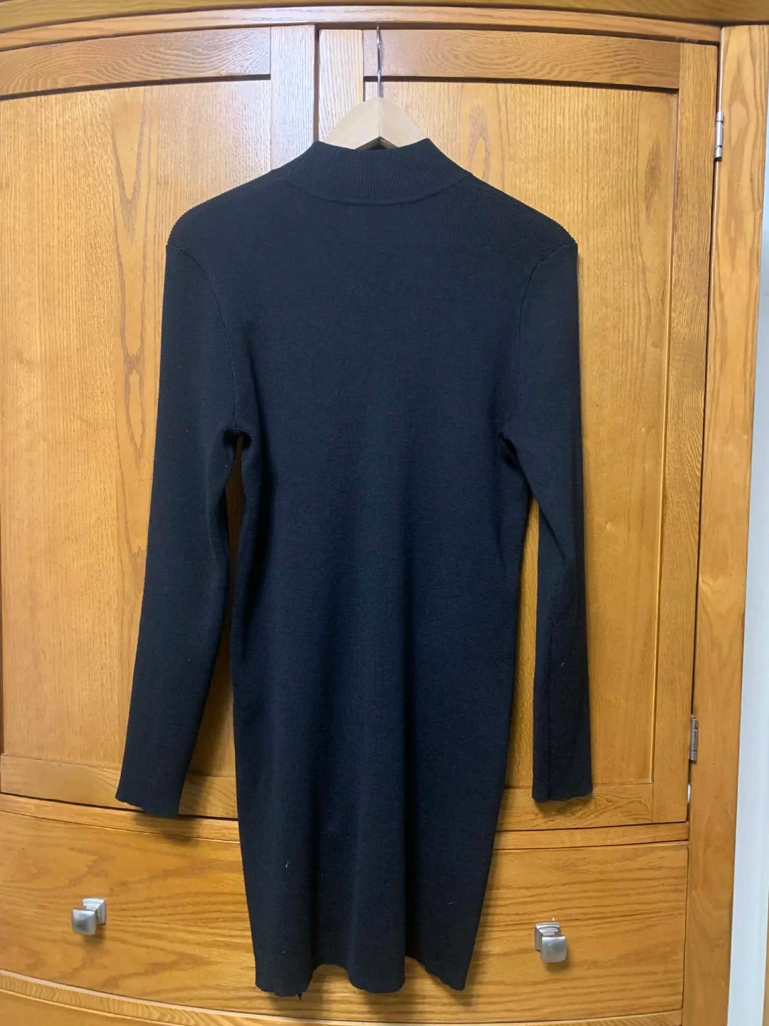 This Cable & Gauge black knit dress features a stylish mock neck and a zippered detail on the shoulder. It has a slit on the side. It's made of a comfortable knit material.