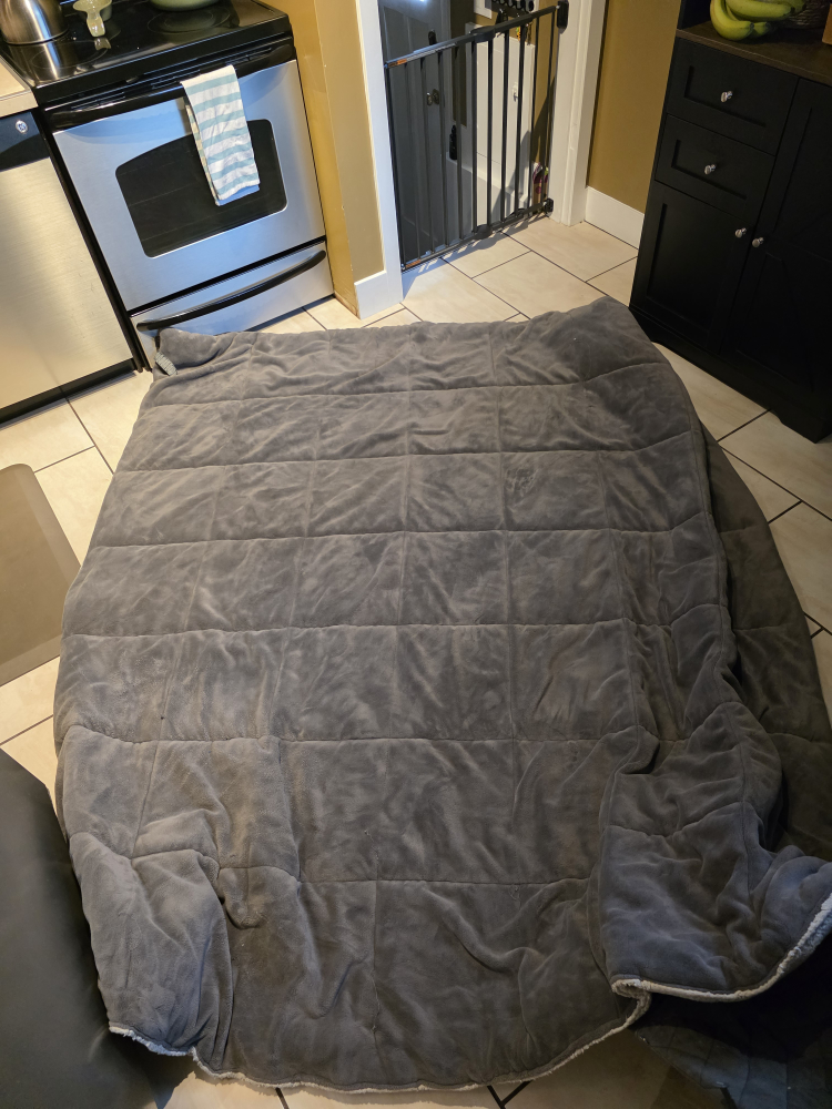 Selling a cozy grey weighted blanket! It's in great condition and perfect for adding some extra comfort to your naps or bedtime. The weight is evenly distributed, making it super relaxing