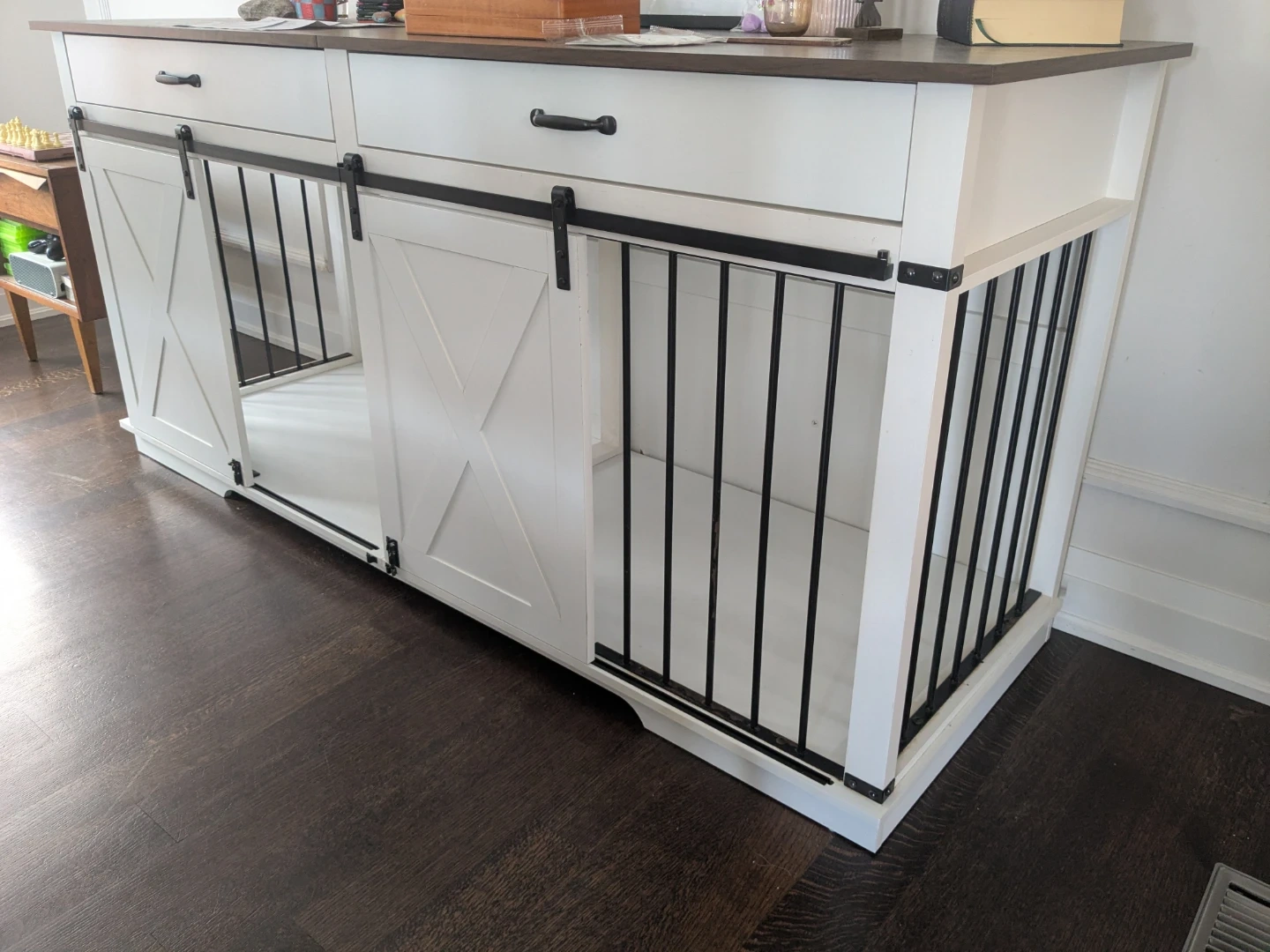 Multi-functional dog crate furniture with 2 doors. Can be used as a dog crate, TV stand, or display stand. Wood construction with metal bars.