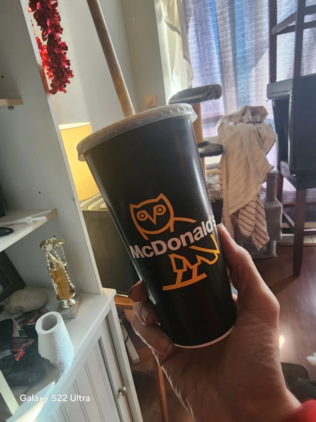 This is a McDonald's cup featuring the OVO owl logo. It's a reusable beverage container. This cup would be great for collecting unique fast-food merchandise.