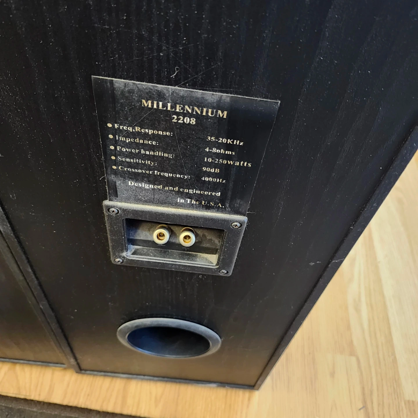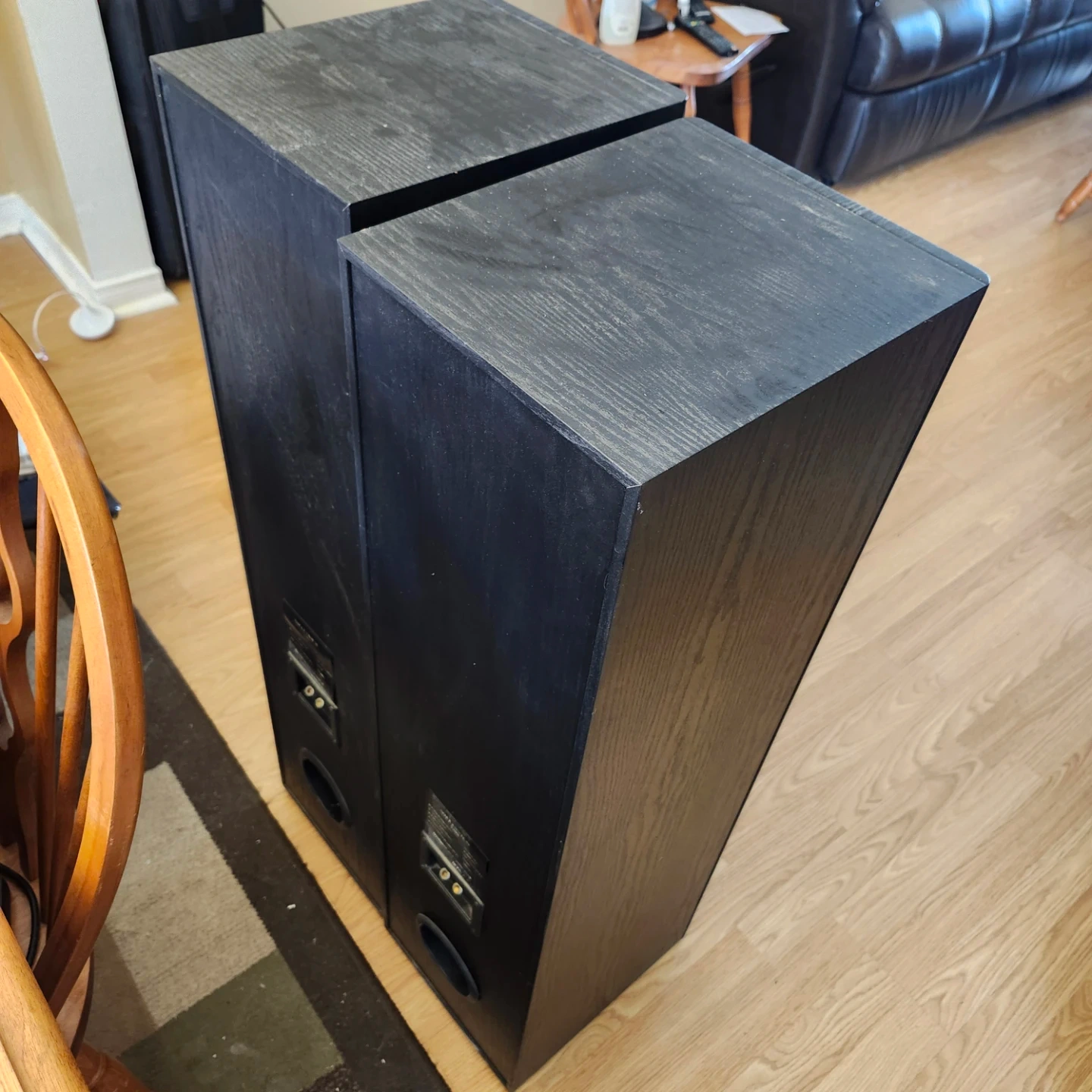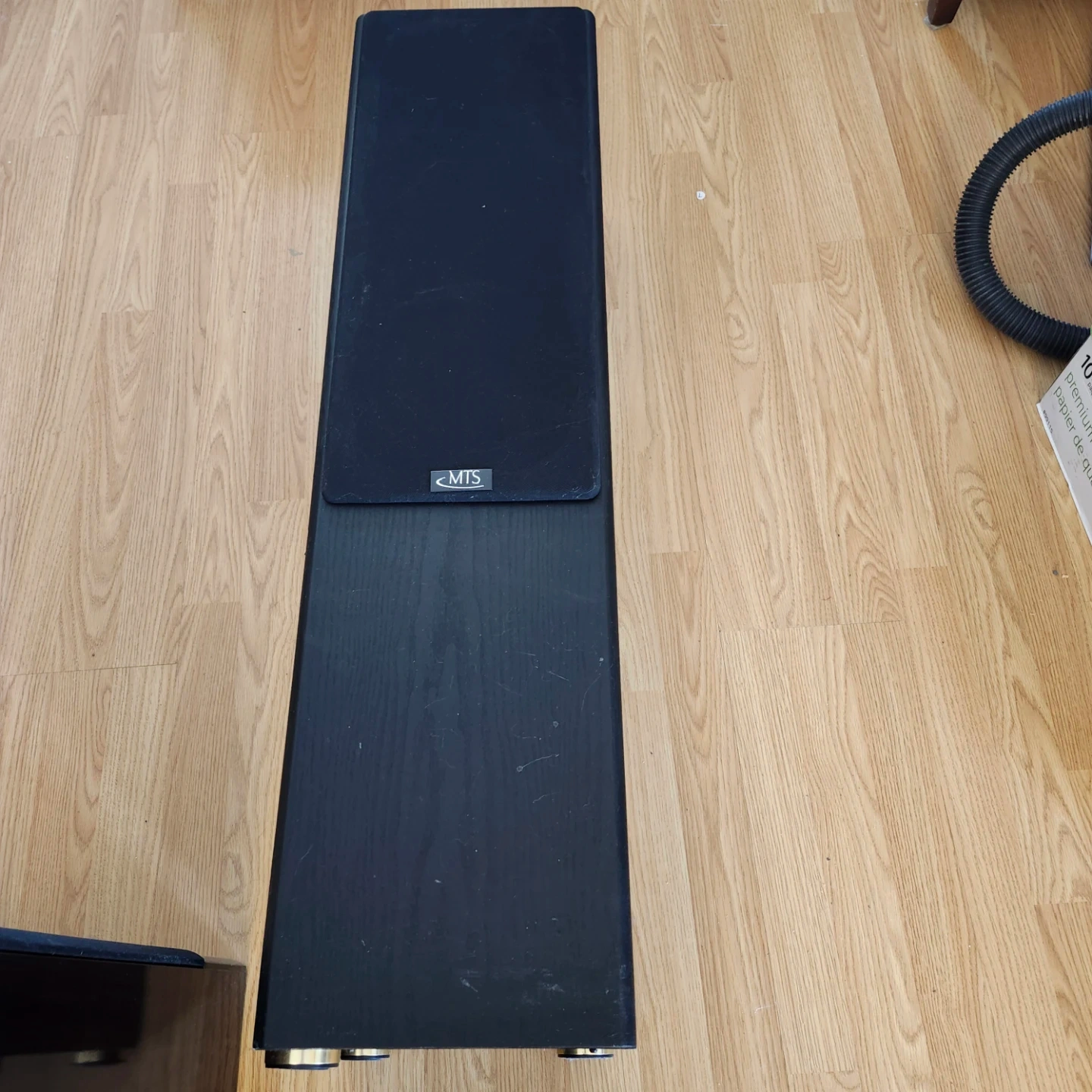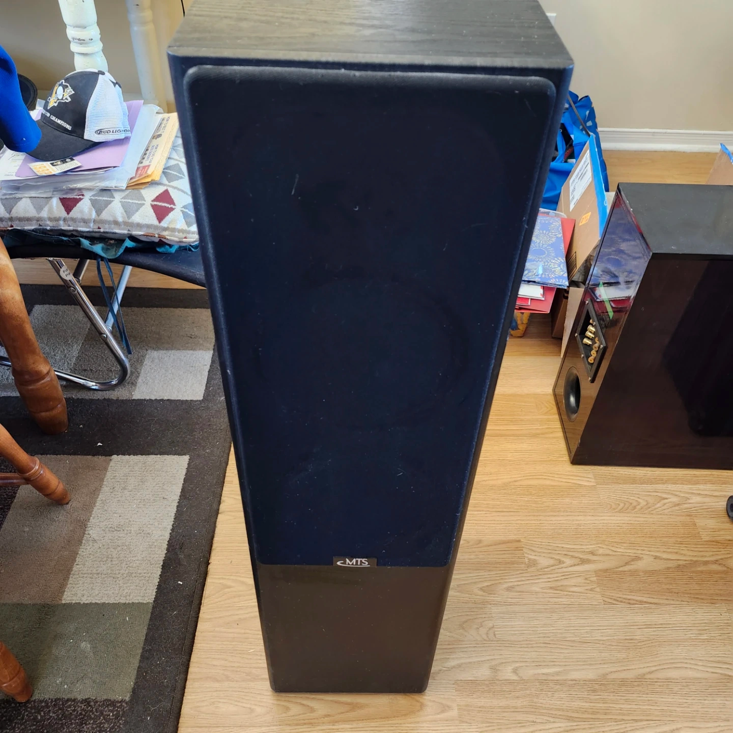 Pair of MTS floor standing speakers in black wood grain finish. These tower speakers are great for home audio setups. They feature a sleek design with black grilles. Includes adjustable feet. Missing 1 bottom foot as seen in picture.
