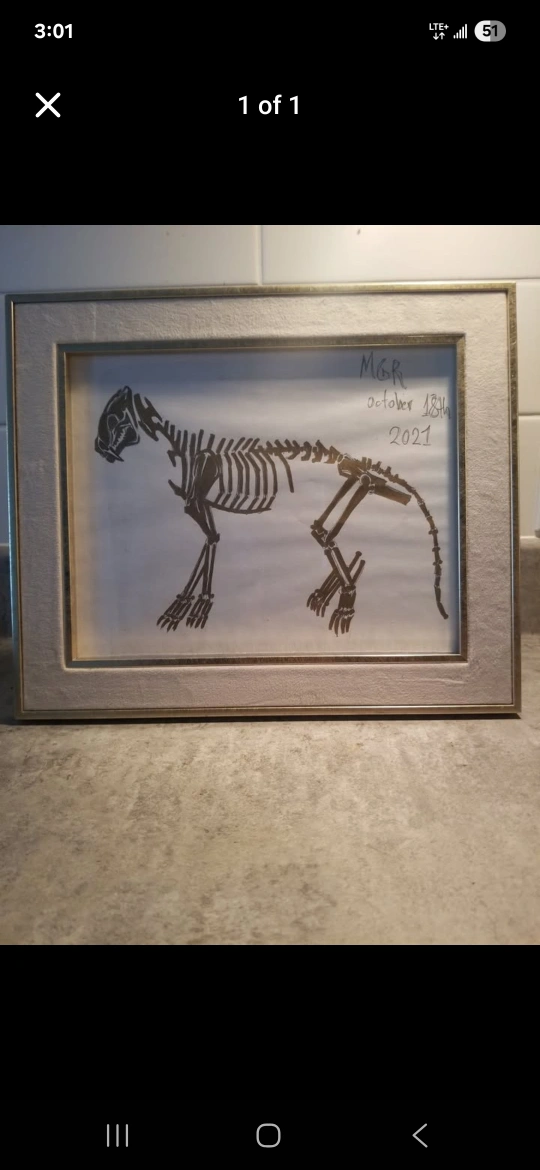 A framed piece of art depicting a skeleton. The art is signed 'M&R' and dated October 18th, 2021. Would like to sell this to make a living.