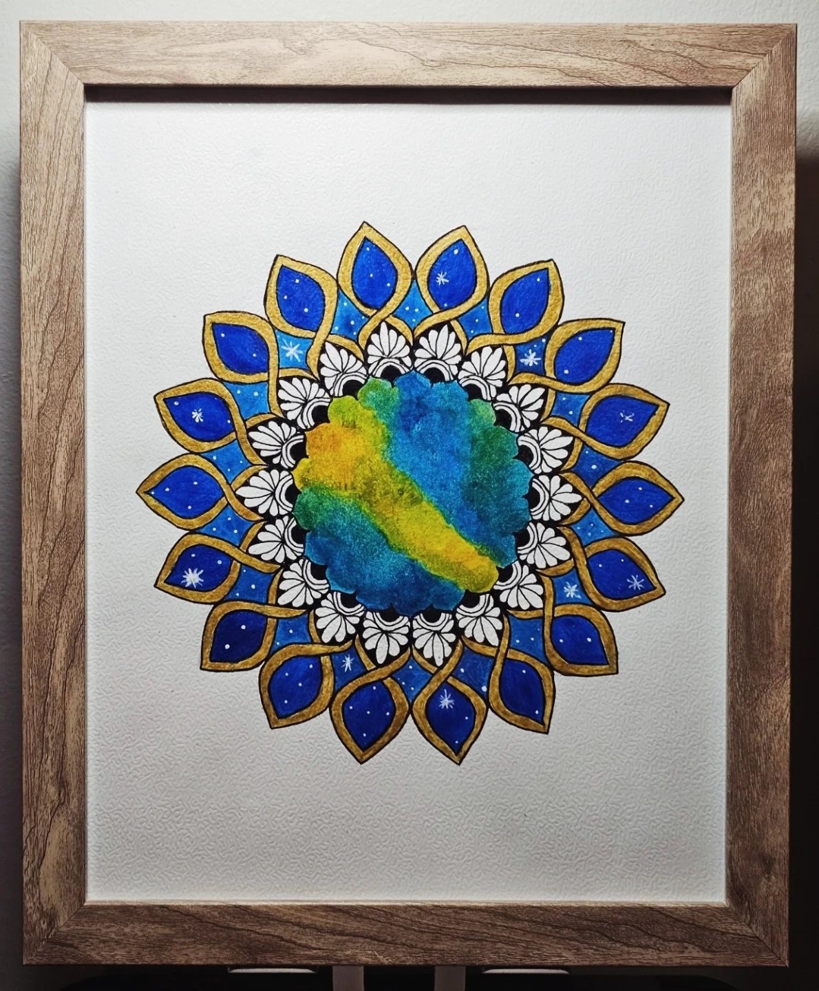 Framed mandala artwork with a globe design. Features vibrant blues, greens, and yellow watercolour paints accented with gold detailing. Ready to hang for home decor.