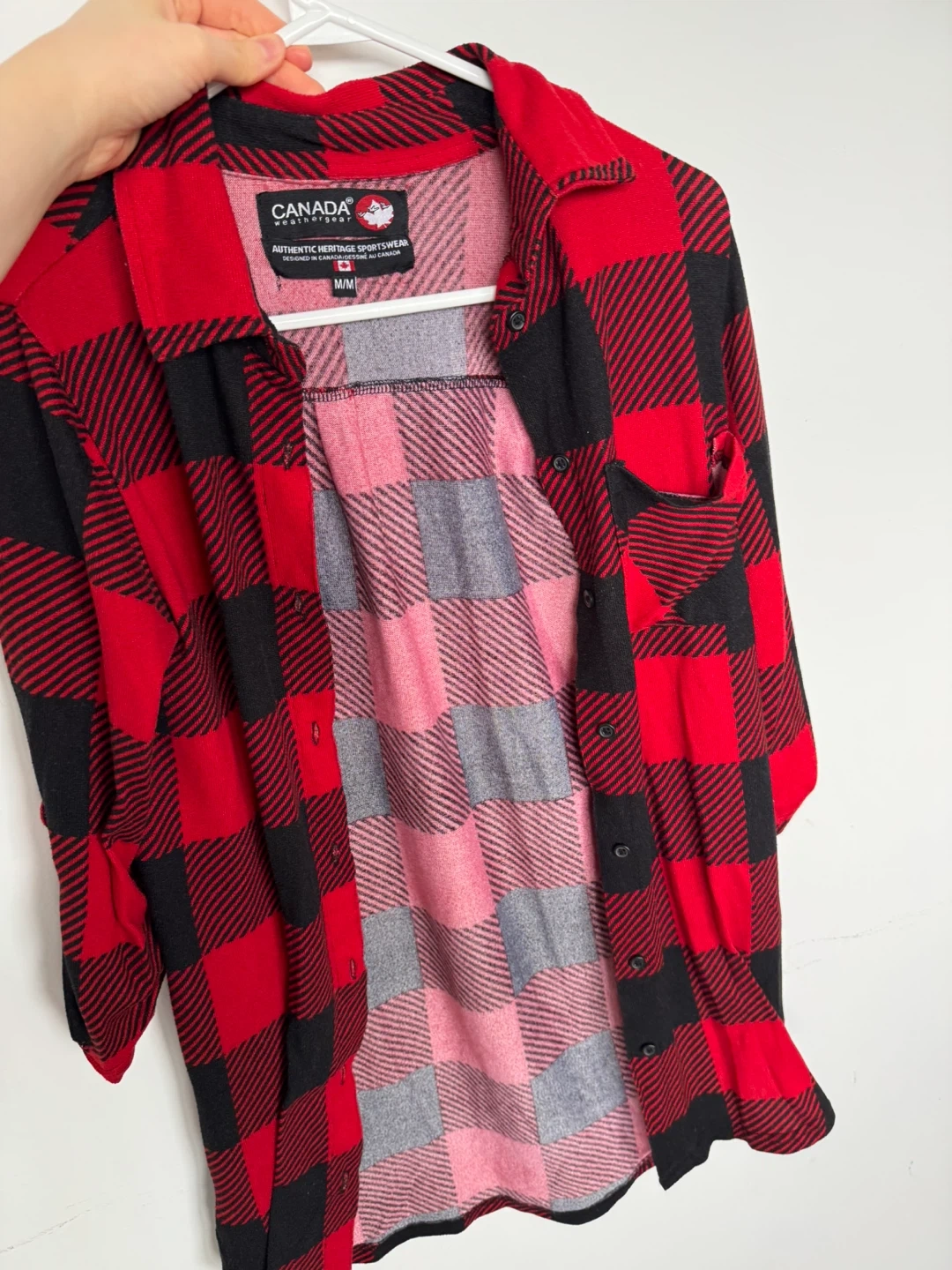 This is a Canada Weathergear flannel shirt in a size M/M. It's a classic red and black plaid pattern. Designed in Canada.