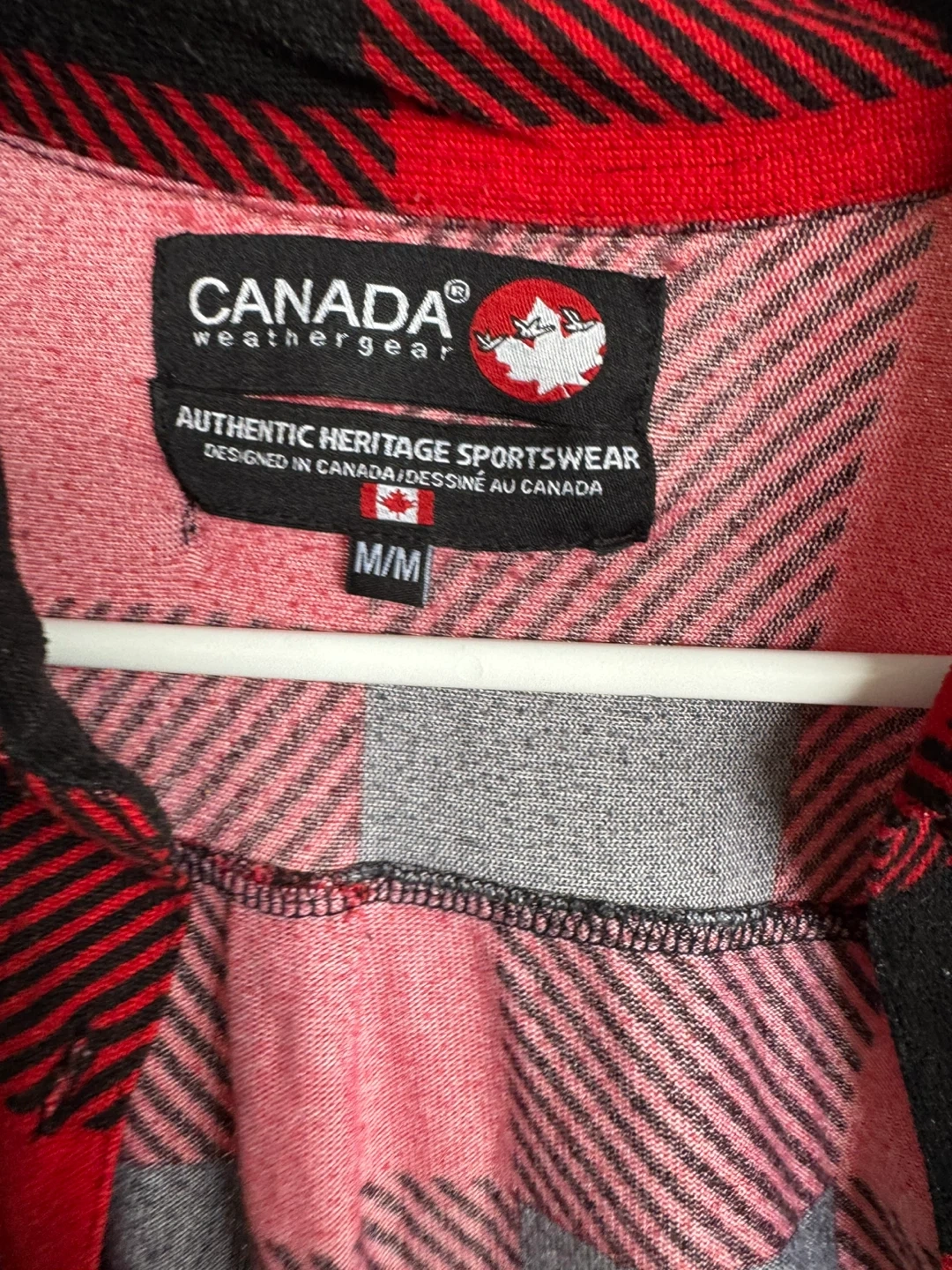 This is a Canada Weathergear flannel shirt in a size M/M. It's a classic red and black plaid pattern. Designed in Canada.