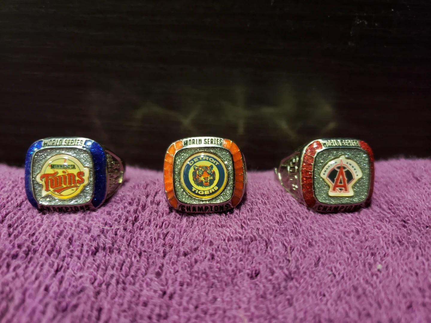 This is a set of three championship rings representing baseball teams. One ring is for the Minnesota Twins, another for the Detroit Tigers, and the third for the Angels. They appear to be souvenir or replica rings. Located in Hamilton.
