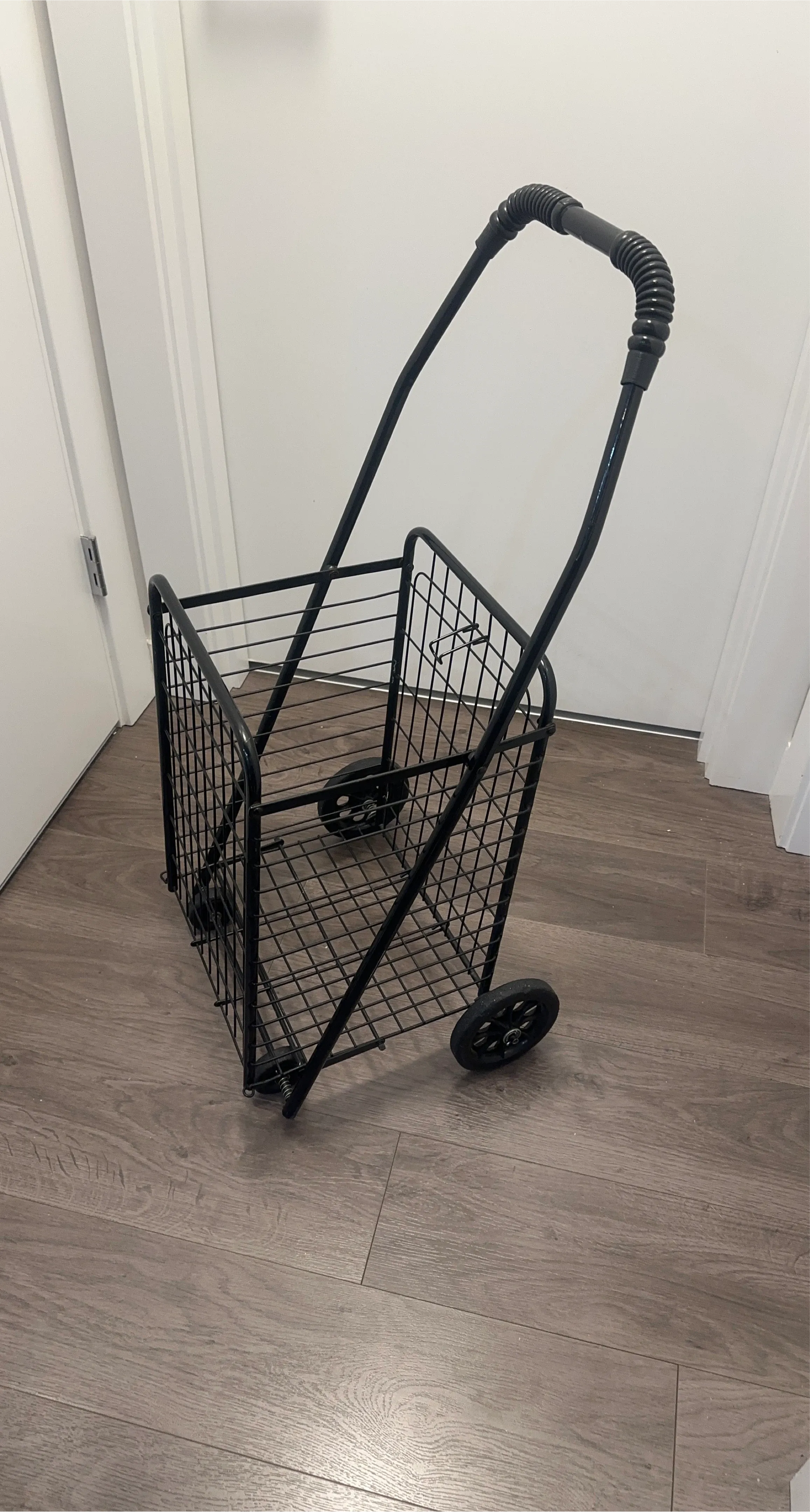 This black metal rolling shopping cart is handy for groceries or laundry. It's made of durable metal wire with a comfortable handle. Wheels make it easy to move around!