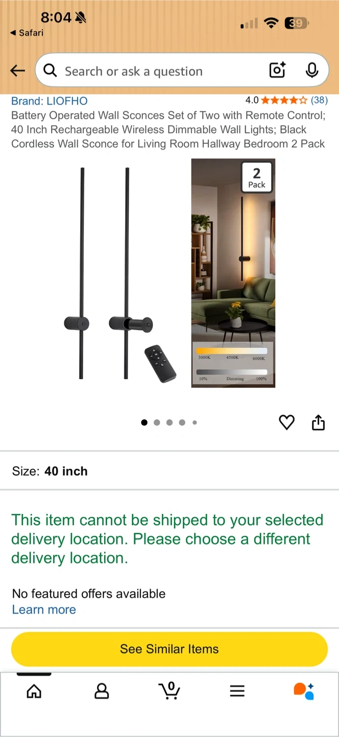 Set of two black, battery-operated, 40-inch rechargeable wall sconces. Dimmable LED lights with remote control included. These wireless sconces are great for adding accent lighting to living rooms or hallways. Easy to install and use!